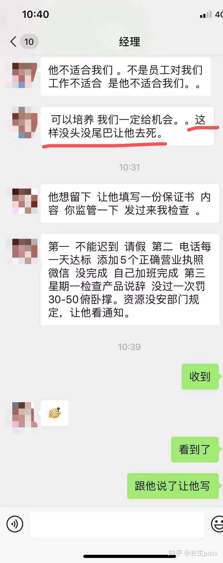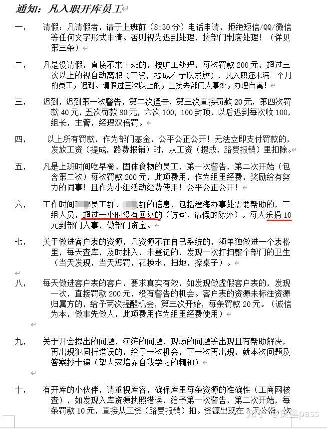 “乐捐”这个词,真的很讽刺,很刺眼。第六条(不在员工群里回复P经理的信息)主要是说我们销售,这一点也是直接在会上开骂,说我们不尊重领导,目中无人,年纪轻轻就没有素质,没礼貌。可是真不是我们不想回,事实是P经理一天到晚在群里发这个部门谁谁谁多少单,那个部门谁谁谁冲前线见客户,之后又是发那种击鼓、吹擂(类似传销)的表情包,真的是无时无刻在发。我们又要回什么呢?