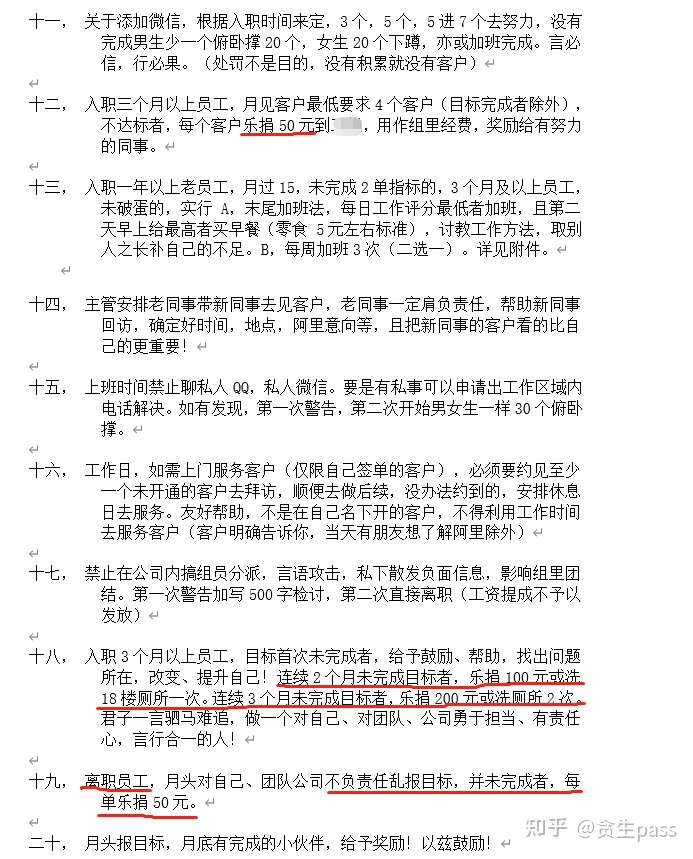 第十八条(连续2月达不到目标者扫公司那一层的厕所)这一条还得提及到报目标的问题。我们员工自己会先在月头整理好总结和目标单数发给领导,而我们报的单数都是建立在对自己能完成的把握上报,谁都不想空口吹牛皮。而领导会根据员工入职的时间长短来报业绩目标,比如来了2个月的是2单,3个月的至少是3单,那像我们老销售至少都是4单往上报。如果领导觉得你报少了,就会在大会上,或者直接给你加上单数,说是有压力才有动力。可是你们自己作为领导,在我所在的这一年,我所看见的,你们完成自己目标的次数,也就1、2次而已吧。你们做了5、6年甚至10年的销售也才这个业绩,为什么要要求我们一个做了1年,甚至不到1年的销售去完成将近你们目标单量的业绩呢?