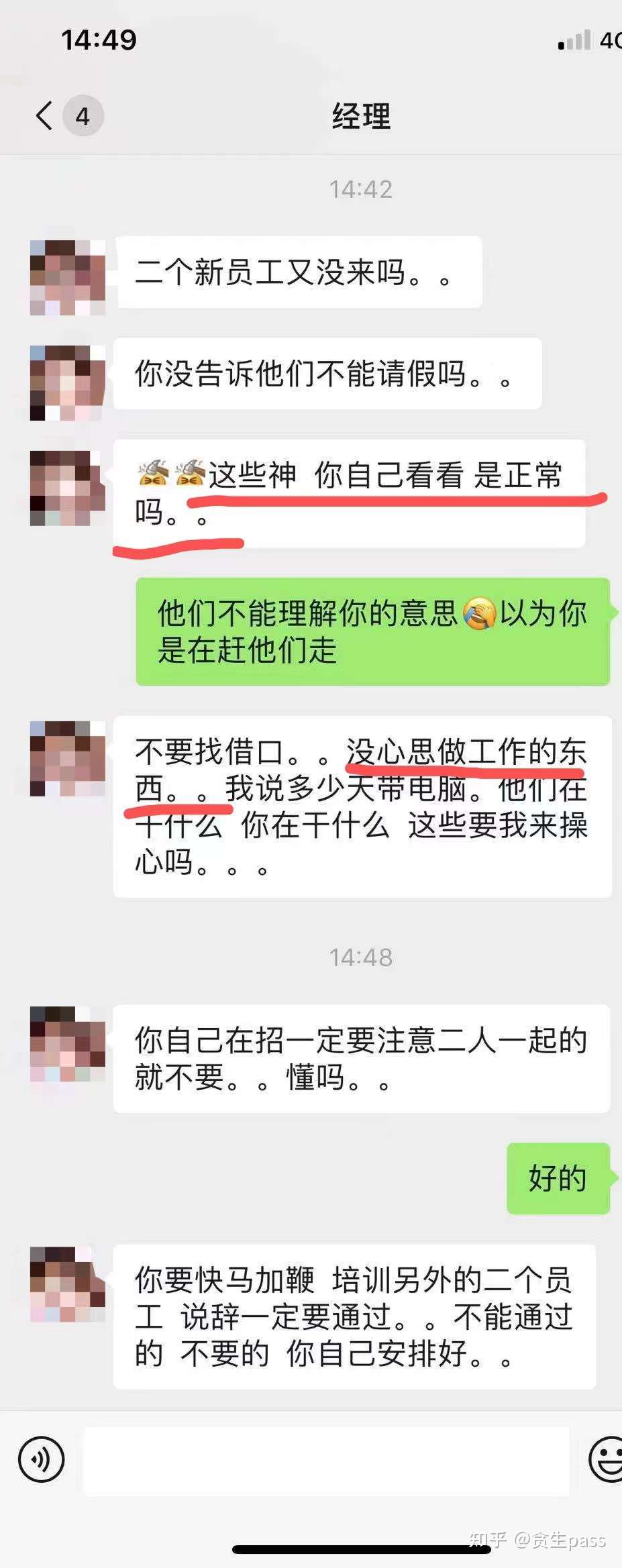 之后招来了hrB,过后不久hrA便辞职了。hrA当时有和P经理约定好的,招满多少人,并且该员工做满一个月便有奖金(我们那三人就是该员工)但是最后我看到的结果是P经理没有按约定好的那样给予她相应的奖金。辞职后不久hrA和P经理在微信上辩驳掰扯,我能得知也是因为hrA把相关聊天记录都发了朋友圈,大意内容是P经理答应hrA招到1个人,并且该员工做满1个月,1个人头就会有100块的奖金,可是P经理没有兑现承诺。