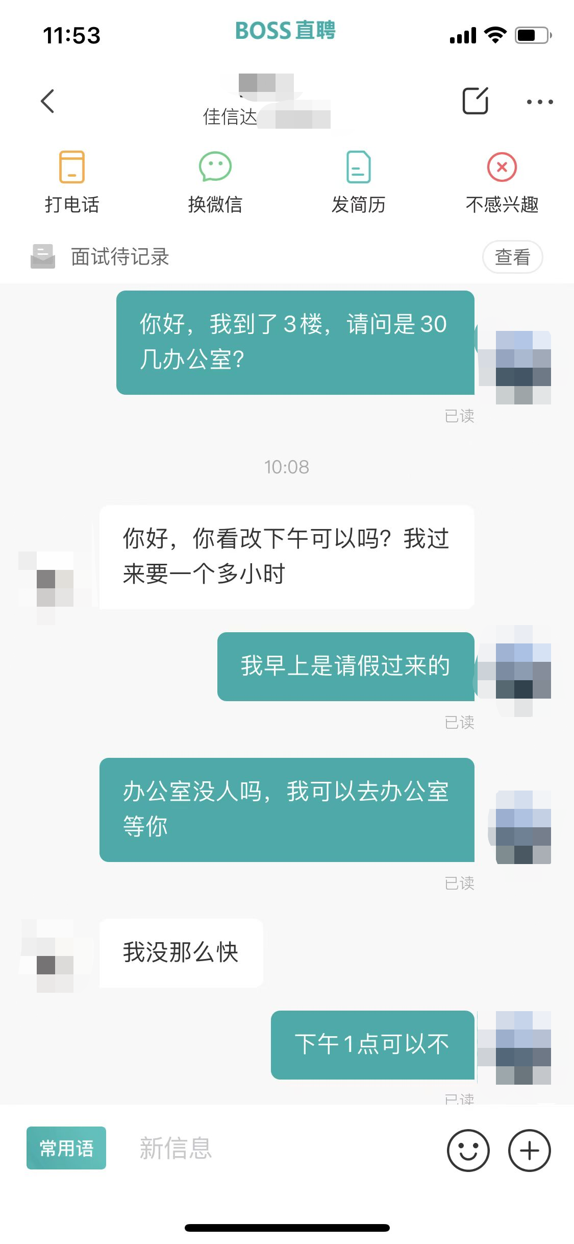 然后在Boss上回复要不约下午。我真是服了,我表示我是请假来的,扣工资不说,你也太不重视了。