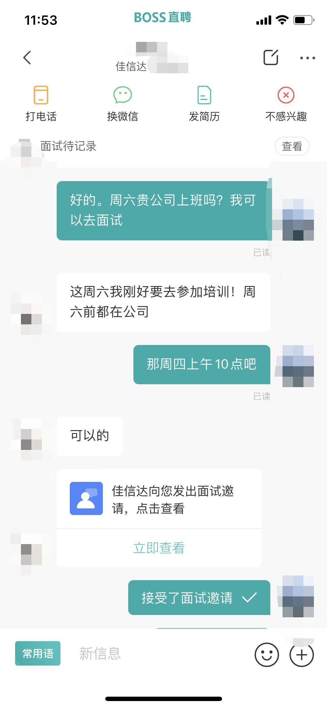 我在职在面试正在找机会。本来约了周六面试,老板说周六没有时间,然后我说周四上午吧,老板同意了,并且发了面试邀请。