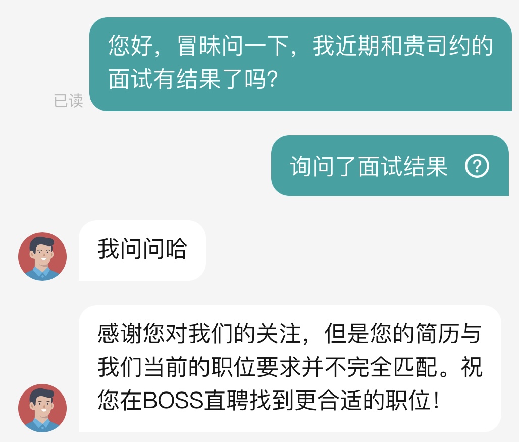 之前线上聊的时候问过是做什么平台的,也发了简历,都说合适才去的,第二天问结果的时候说的简历与职位要求不完全匹配,无语了,什么话都让他们说完了呗