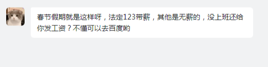 然后,公司还有个“无薪日”,就是不需要通知给员工,直接春节放假七天,然后二月三月一共少发三天工资,还怼我说没上班还想发工资?嗯还假惺惺和我说放假是为了我们好,春节大家都要回家,行,但凡发工资前几天通知给员工知道我都能接受,但是事前事后没有任何通知哦