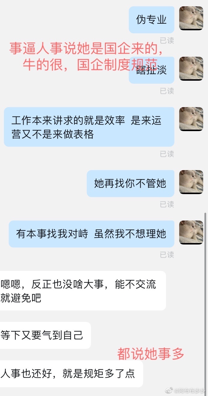 9. 这个人事简直是脑子有问题,事逼,很多不平等规定都是她拟定的,所以在公司的人缘不好,几乎没人和她说话除了工作