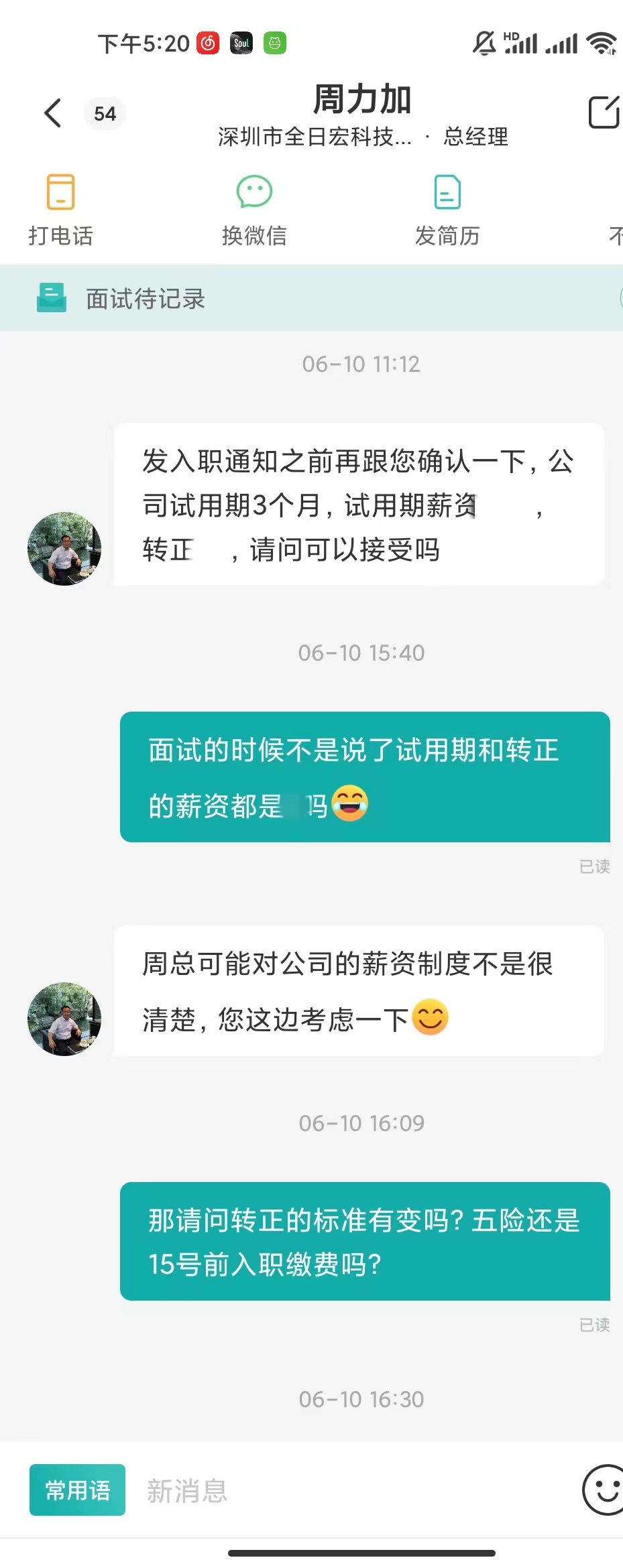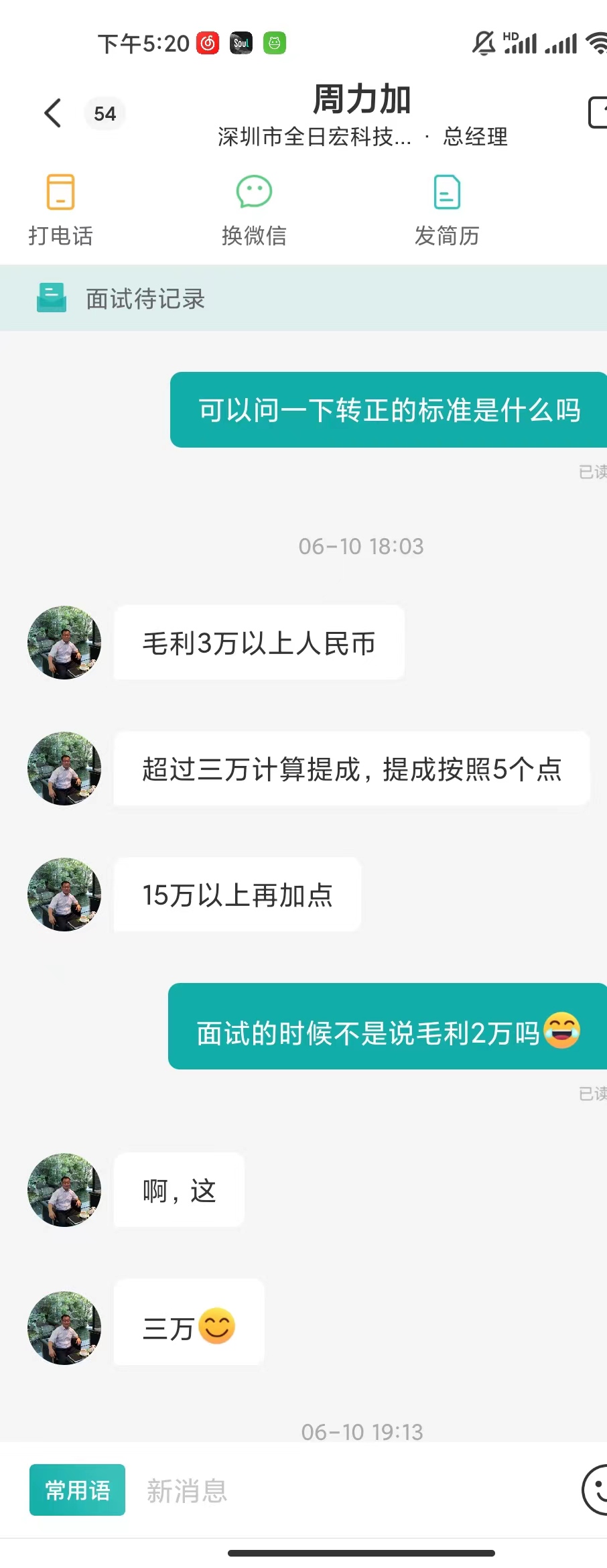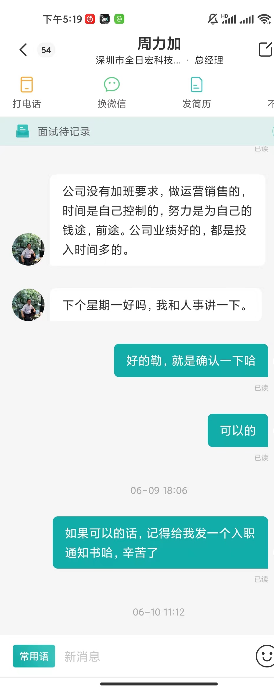 白天在boss上聊天,然后过了3天直接在晚上7点多打电话来跟你聊,是很能聊的,一位姓周的经理跟你聊天,电话聊了半个小时,无比的热情,然后约你第二天去面试;第二天面试的时候是先人事跟你面试,然后再到一个日本站的运营给你面试,她给你面试的时候还在玩手机,给人不太尊重的感觉;最后是那个给你打电话的经理给你面试,还是一如既往的热情,又聊了差不多一个小时,全程的面试时间花了差不多2格小时;最后那个经理问你什么时候能入职,就是当初就通过的那种;然后我说我回去考虑一下;晚上他在boss上问什么时候入职;第二天的时候跟他说了下周一入职,因为当时已经是星期五了;然后他可以。然后我就叫他给我发一个入职通知,他拖了半天回复我说薪资有变,跟面试的时候说的不一样,我就纳闷了,就问他是因为什么,他回复说经理不懂公司的薪资构成。后面我就在继续考虑,后面我为了预防万一问了他,提成和转正的标准是否有变动,老半天回复,又变了。总之薪资和提成,还有转正标准都和面试的不一样。后面看我没有回复,他又变卦了,说还是按照面试的时候来。那我同意了。入职当天又跟我说,不好意思,我们已经找到合适的人了。我直接一个大无语了。说真的,不是真心招人。刷KPI的吧。还有就是,这么容易变卦,信用度不高!我就觉得我太倒霉了,当时我还有别的几个offer的,我就决定去他家就把别的拒绝了,真的很可惜!这是我个人的面试体验,大家可以参考一下。还有就是,他们在boss上的是猎头公司。一下附上当时的聊天截图