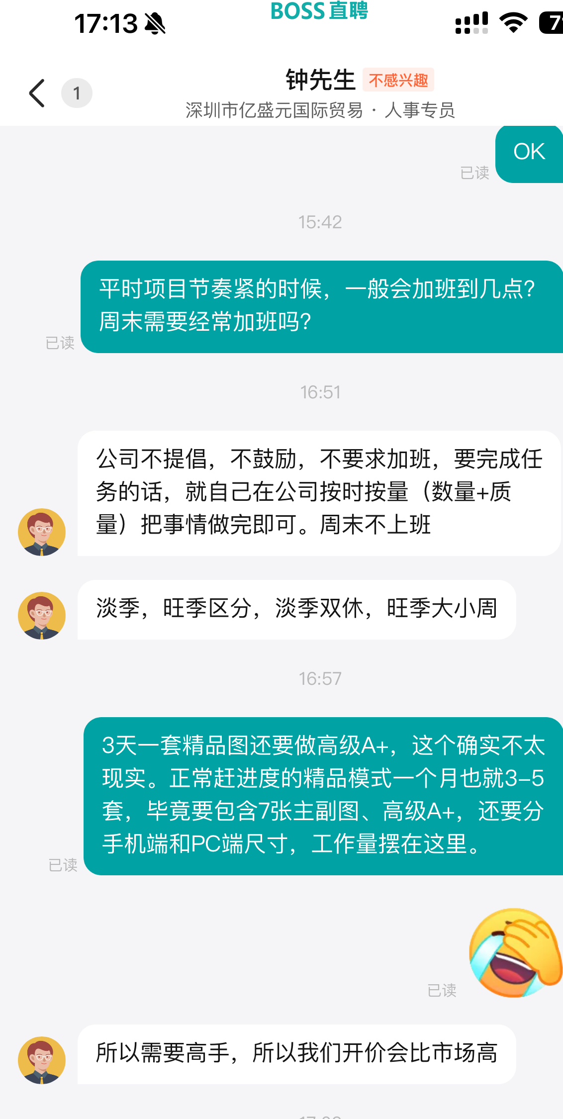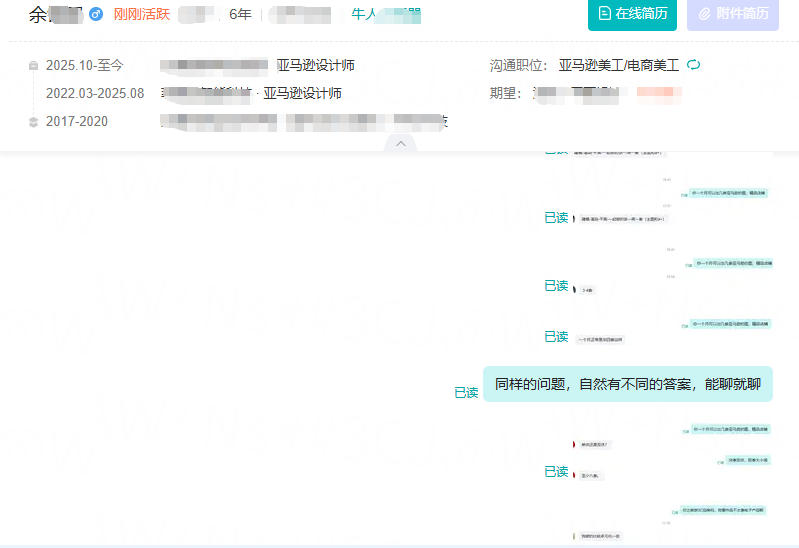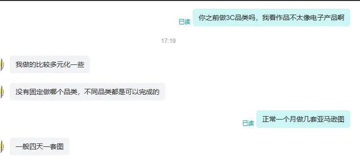 正式跟各位奋斗者说明情况,本公司计划招募一个亚马逊美工,由于职位一开放,就有非常多的简历和作品发送过来,本人都做了一一回复并沟通,如果人家跟你打招呼了,不回应,就算是线上沟通,也显得不太礼貌,但,本人也只有一双眼睛一双手,最多也就能和10个人同时沟通,这位余先生也知晓,BS平台沟通中,跟其他求职者问了同样的问题,同样的问题收货了不同的答案。正所谓一样米养百样人,非常正常。这位余先生的设计能力是得到我同事和领导的认可的。所以离开公司后,继续在平台上聊聊。我将于其他求职者同样问题的惠东截图附上,请各位看看。 反正一句话,同样的问题不同的人有不同的理解和回答,总体是3-8套不等。祝各位心怀理想的求职者或者在职伙伴,2026年顺顺利利。 本心此刻心绪也不太平稳,无端被刀,文字语法逻辑不足之处,见笑了!