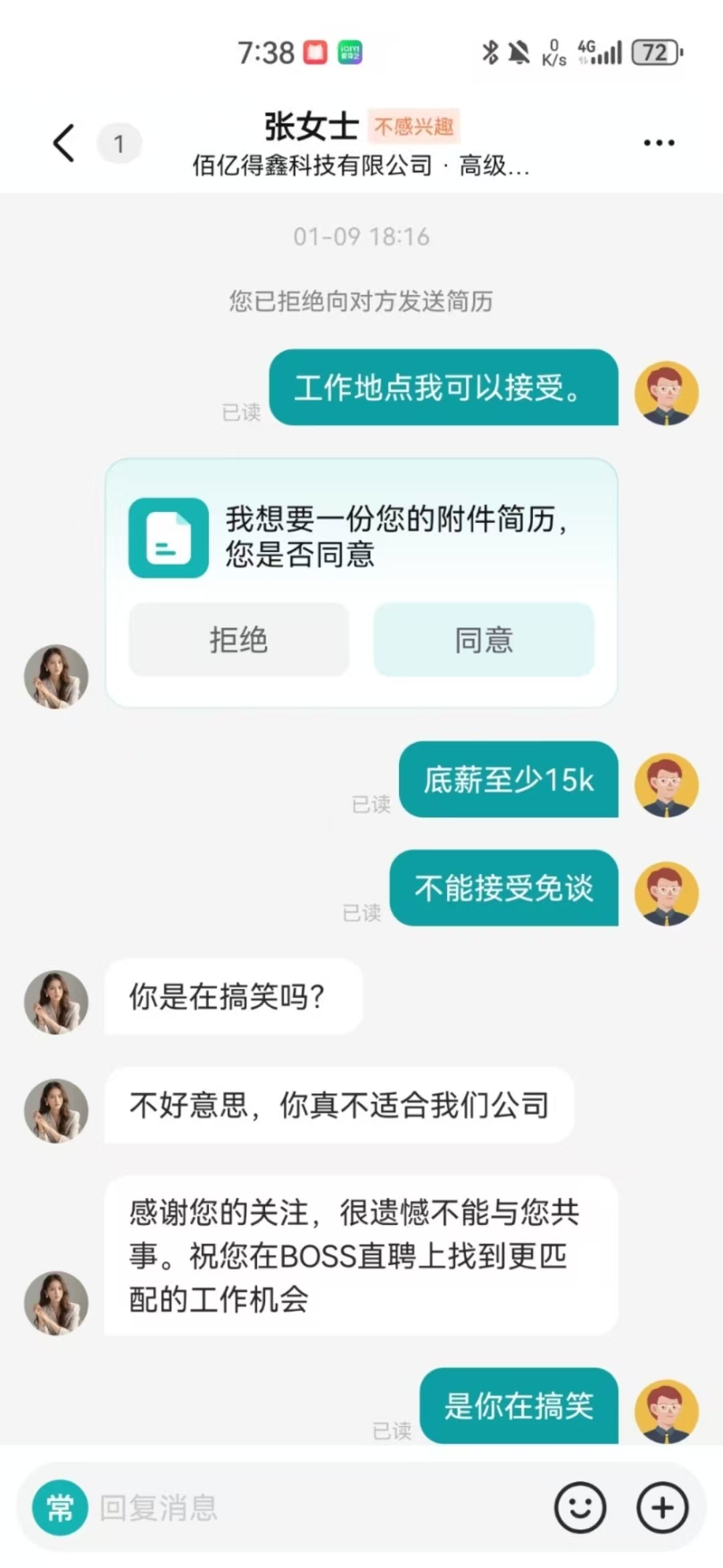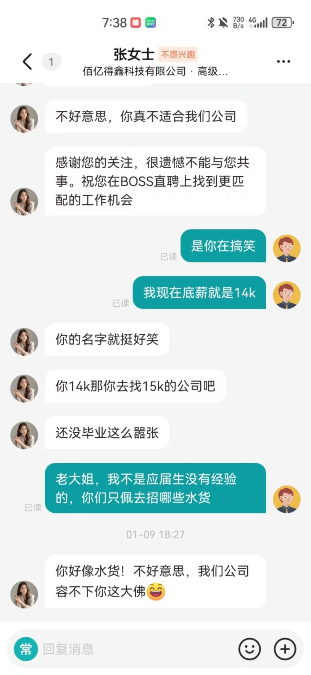 垃圾公司,什么玩意,2025年12月份这个傻逼公司的这个自称”张女士”的狗东西给我发招聘。刚刚开始就问一下七里八里,和工作上没有任何关系的,然后问我薪资多少。我当时还在原公司底薪就14K,想着上上boss看下,能不能跳槽涨薪。这个傻逼问我多少薪资,我说低于15K免谈,这个傻逼就在哪里恶心人。