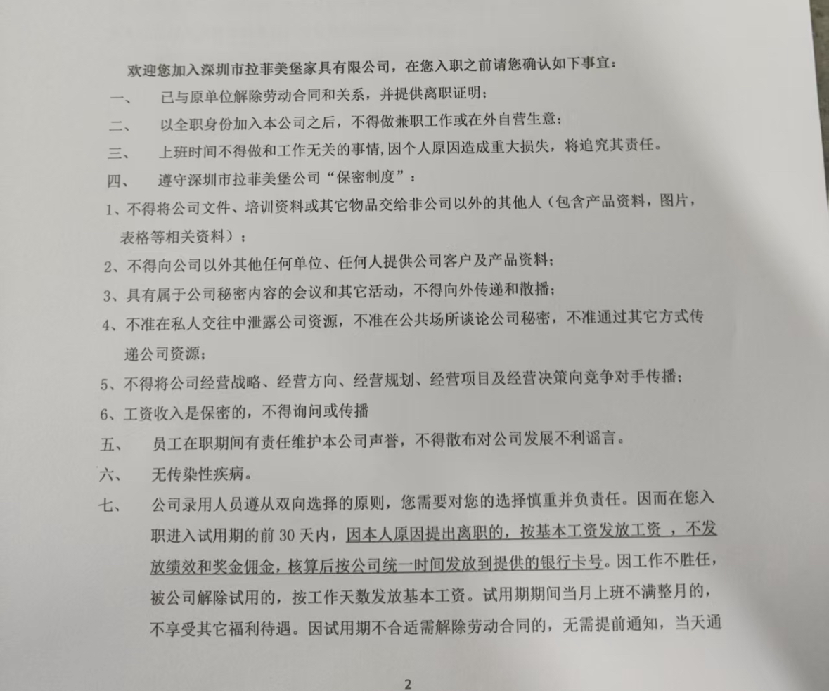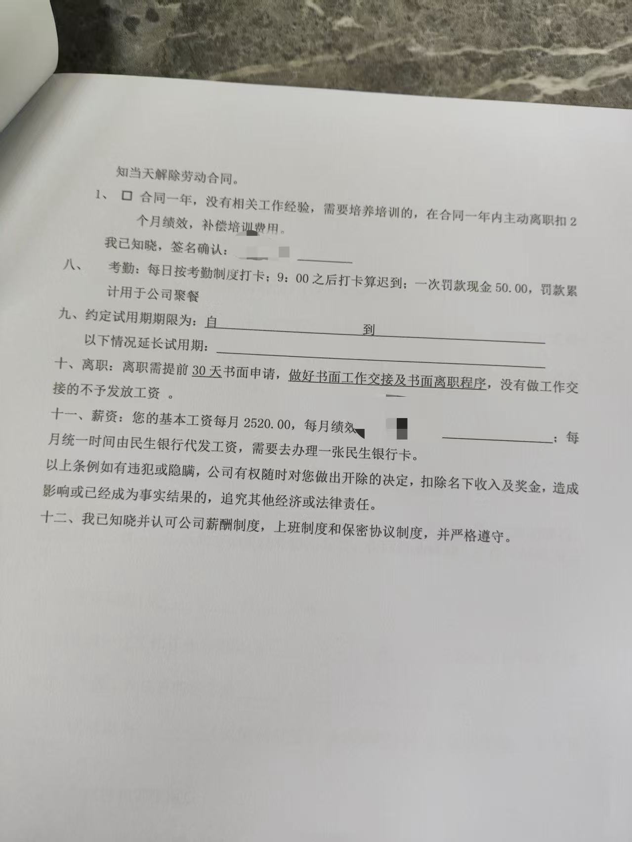 2、劳动合同,霸王条款中的霸王,合同只签一年,如果你在一年内自离,当月只发深圳最低基本工资(2520元),其他所有的绩效提成全给你扣完;其次如果你没有经验,还要扣你两个月的绩效工资作为补偿培训费用,工资构成就是基本工资2520元+绩效工资,就是你的综合薪资,白干一个月最后发深圳最低工资,自己想想值不值得吧,劝全各位谨慎再谨慎