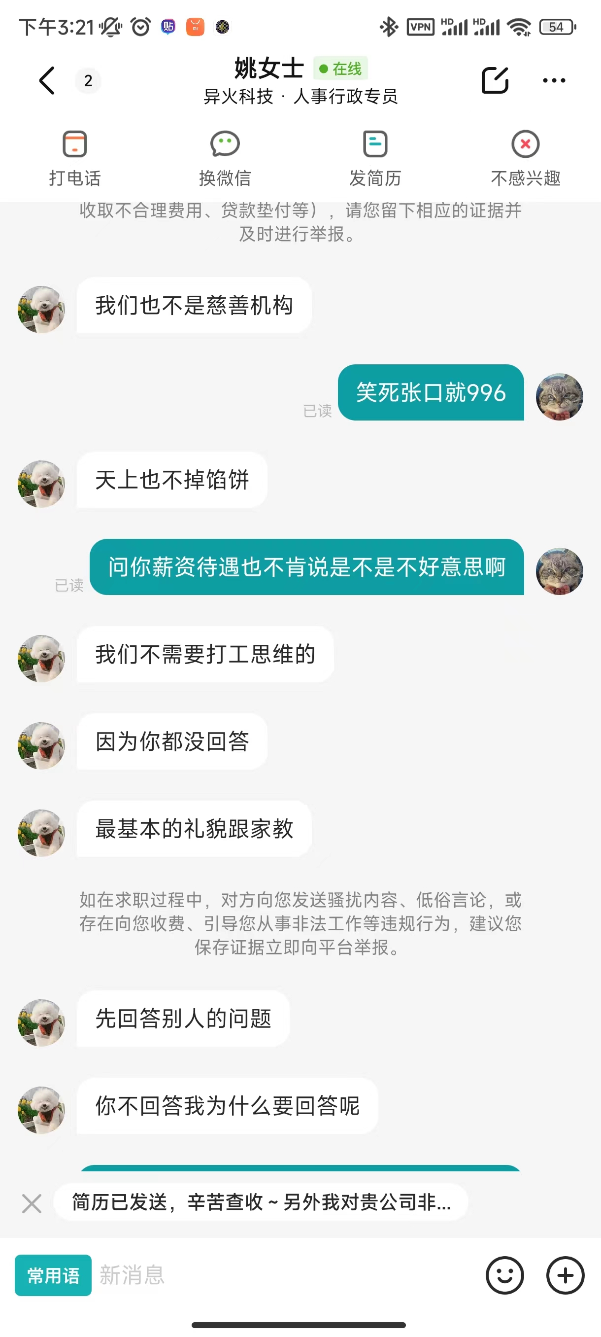 hr一上来就问我接不接受996,我说我要根据薪资范畴才能决定接不接受,她说我不尊重她不回答她的问题,我的妈这逻辑思维也太逆天了吧,你996都喊出来了我询问一下薪资不过分吧,薪资结构决定了我的答案,我反手就是一个举报,然后hr就各种羞辱我,素质真的太低了。我建议hr直接把“不接受996勿扰”的标题直接打上去。