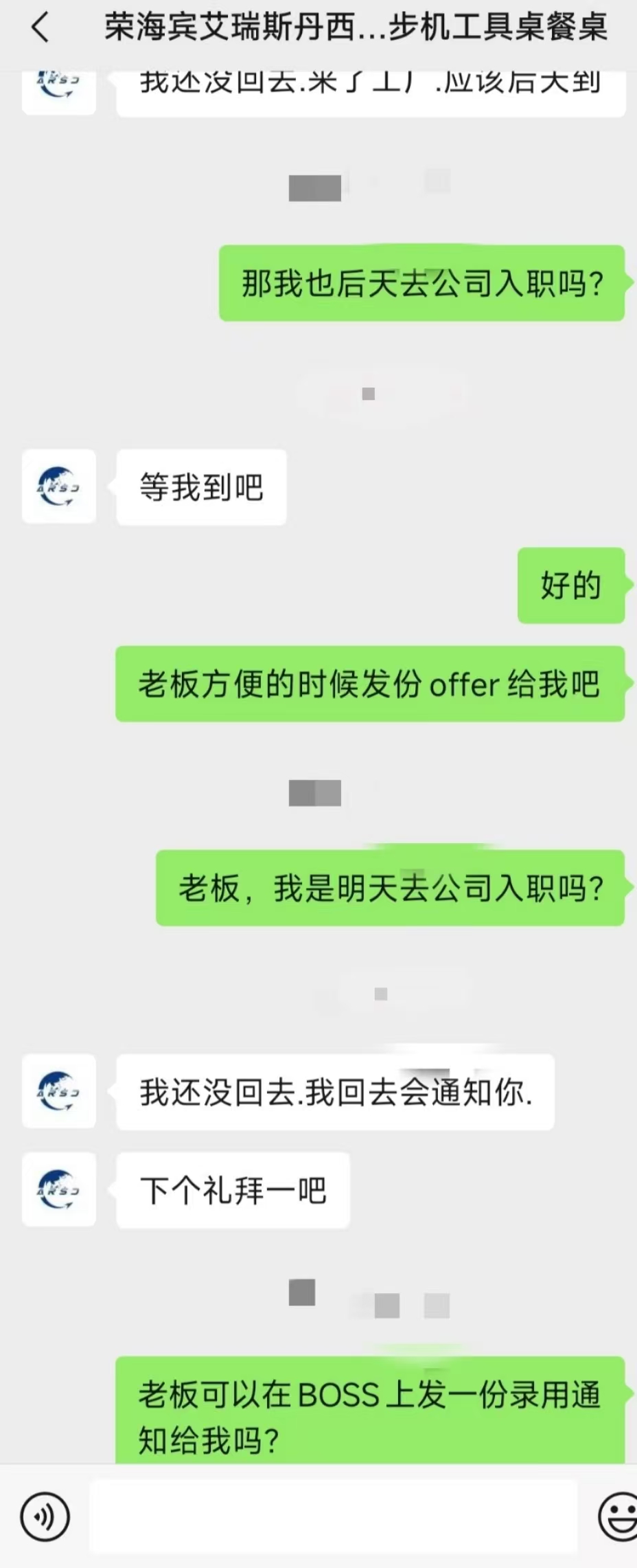 然后重点来了,面试最后有意录用我,加了微信,我说要考虑一两天,后面我给他答复同意入职,入职时间他却一拖再拖,先是说周一入职,后面又说要下周一,最后我也没问了就不了了之。