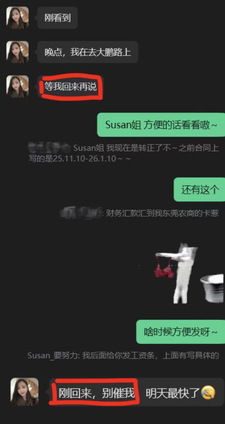 和下属沟通却不给明确时间 说好的外出完回来说,等她回来了你去问,她又说你催她(每个员工都没法看自己的工资条)