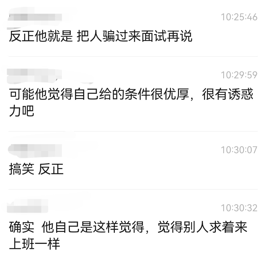 总结:此公司的老板是需要一个傀儡员工、愿意上班垫钱、被PUA的人,所以你要是没有思想没有灵魂好摆布的、对薪资要求不高,能忍,能舔的尽可一试,会很适合。如果你有思想有灵魂请另择好司。