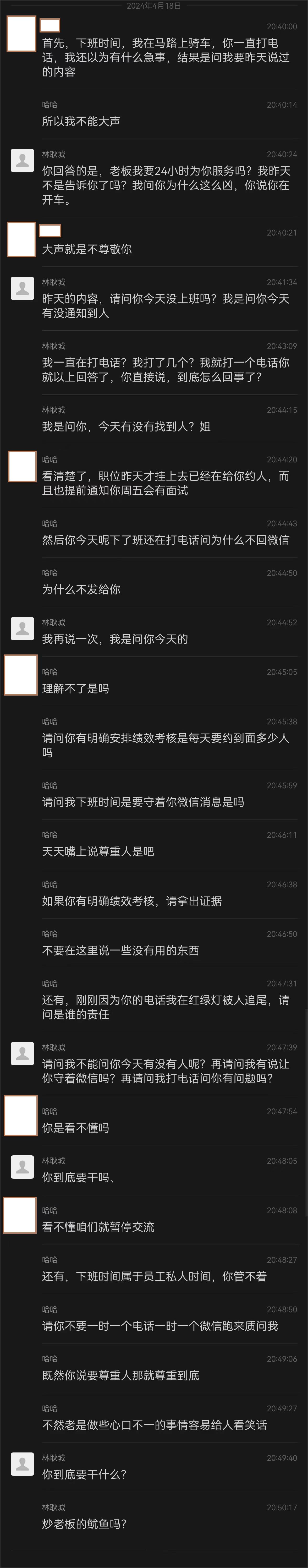 “然后这傻逼他跟我讲,开头他要招一个主管,他跟我讲,他打字跟我讲,他说40岁以下,我是约了一个38岁的。他跟我讲,他说你不要为了凑人头而乱邀约,我说怎么了吗?我说这个人是符合你的要求,我才邀邀请过来的,然后他说他都38岁了,他都说已经超过我要求的32岁年纪了。我说没有啊,他可以面试主管,你不是说主管40岁以下吗?他说是吗?我有说过吗?”