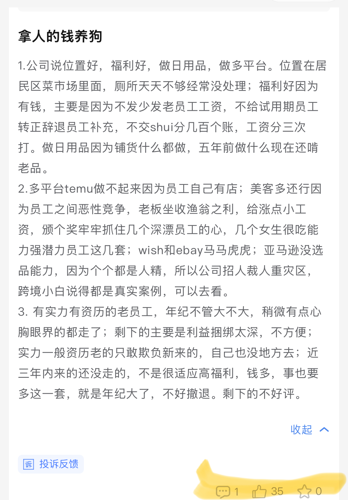 其余: 1面试的时候会吹高客单价精品,实际上接手的都是低客单价铺货,而且清货链接占比大。 2会说公司销量销售额多高,实际上最赚钱的给不到你,都在资深员工手里。 3从年初开始不断开会,不断封号封店,链接侵权,开会干啥?降你利润改你绩效呀。 4内部一团乱,人员翻盘率极高。从年中到现在快年尾,开发换了好几轮,财务是财务啊换了好几轮。昨天还在一起聊天的同事,第二天你就会看到座位空了。试用期的女生跟行政吵架趴桌子苦被我看到,转正了的一个小女生天天走的时候都看到她电脑开着加班,被劝退那天哭着跟家人打电话被我听到,从年初到现在也看着几个老同事慢慢走。没补偿,一分没有。 5公司经营不好已经传到其他同行众所周知了,公司发不出工资了。财务问题不会给你解释,公司10号-15号-20号到现在月底才发得出工资了。