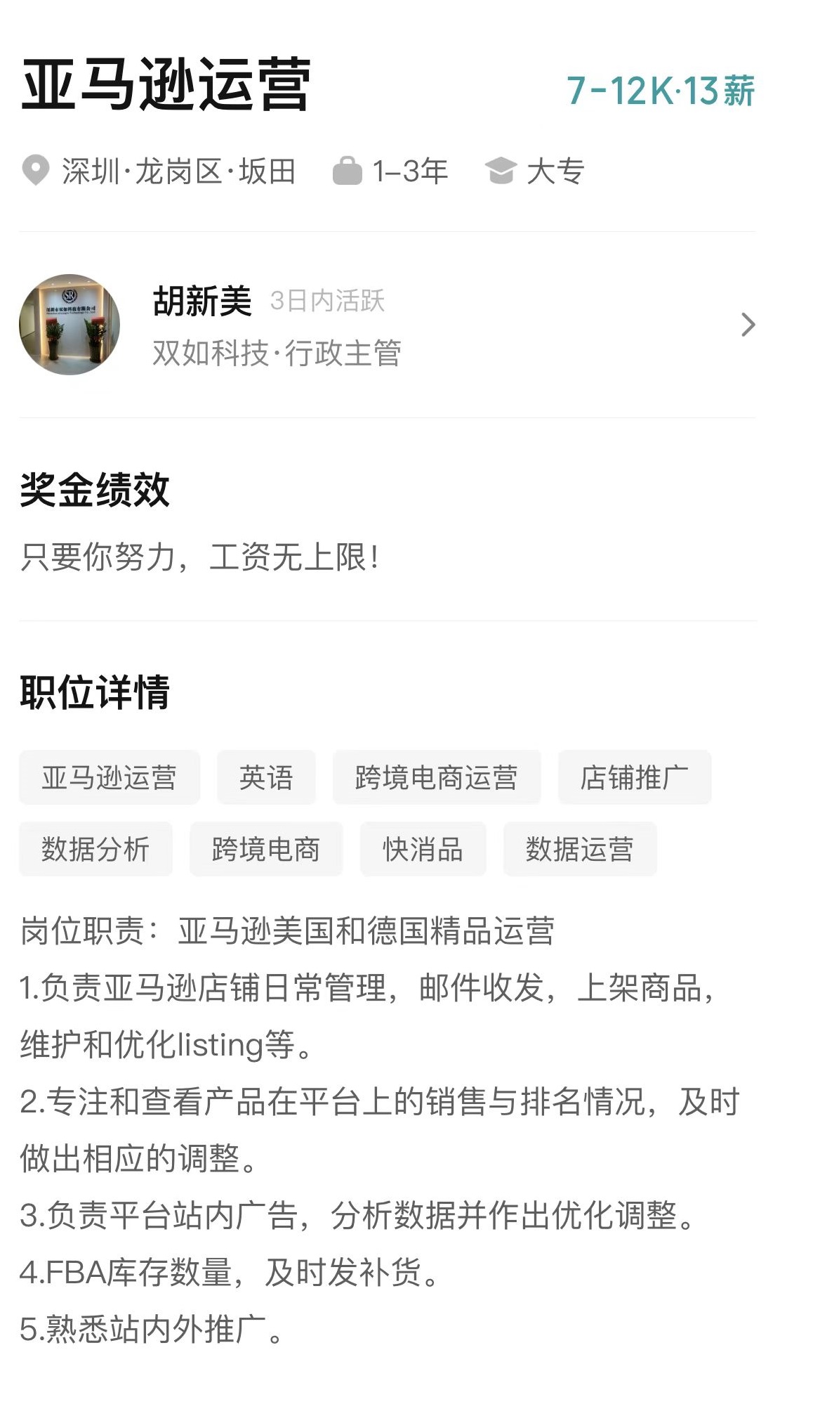 首先这个女的就是老板,其次我有个同事进去了,她说这个老板啥都不会,就只会叫你做,还嫌弃你学得慢,工资是5.5定死了的,不管你的期望薪资是多少,不管你多少年的经验,还有boss上谈的一律不提,一去到就是照着一张纸的问题念,全程眼睛离不开那张纸的,答辩吗大姐?问了那么多人也该背下来了吧,面无表情,学下表情管理吧,问完她那张纸后,就是问一些有的没的,你的优缺点三个词形容,说完了就直接说她那里的薪资是5.5,然后试用期不交社保,你要是想交,公司可以代缴,但是自费。手机壳,一天一百单,哪天达到了就转正,无利润要求,她说很好达到的,单价小的产品,转正后社保可以还给你,几百块,算得很清楚。然后就没下文了。最近还找过我 ,我都不鸟她,还问我有没有证书啥的,健忘症。面试了都忘记了吗!
