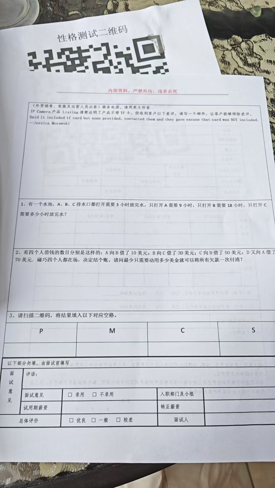 对了,一上来,还要填一张表格,然后背面是用英文写邮件,底下是逻辑题,最后还有一个二维码让你扫描测试性格,全程做完花费了半个多小时,这期间我一直是在公司外面走廊上写,没有空调,深圳现在温度不用多说了吧,身上的汗,半个小时一直没干!复试的时候是一个女经理,面试的那个会议室空调遥控器坏了,然后也是全程没有空调。顺便说一句,她们面试的hr声音都很小,完全听不见他们在说什么!公司里面有一个大音响,一直在放音乐