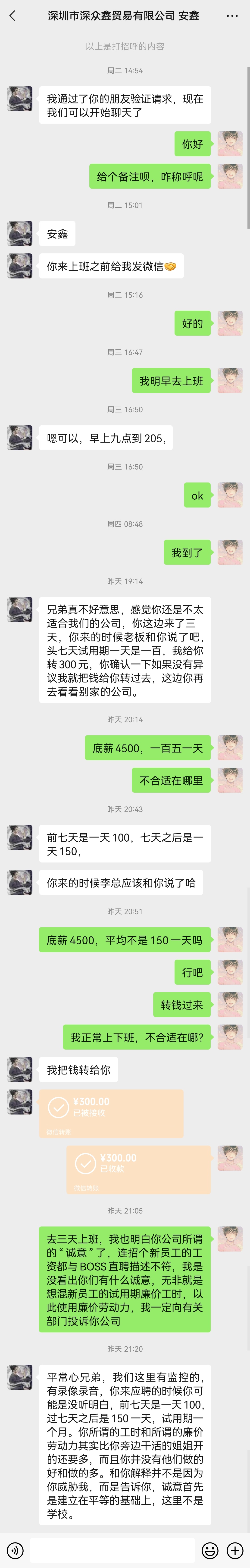 严重怀疑该公司故意使用新员工试用期廉价劳动工时,反复招聘新人,仓库打包干活几天,以“不合适”为由就辞退,本应按日工资150计算,但只给100块/天薪资,(深圳最低工资标准2400左右),辞退补贴低于招聘信息和面试是说的底薪平均计算!据我向同事了解,说新员工一般吃不了苦,不到一周就会辞职走了。现在知道了其实真正原因是被公司辞退的,公司背后跟其他员工说别人坚持不了,自己跑路了,我真的呵呵!!上班三天,都在仓库打包分拣货物,手没停过,按时上下班,无其他违反规定情况下,突然就被辞退了,说“不合适”,其实被辞退真正原因是晚上没去公司加班。