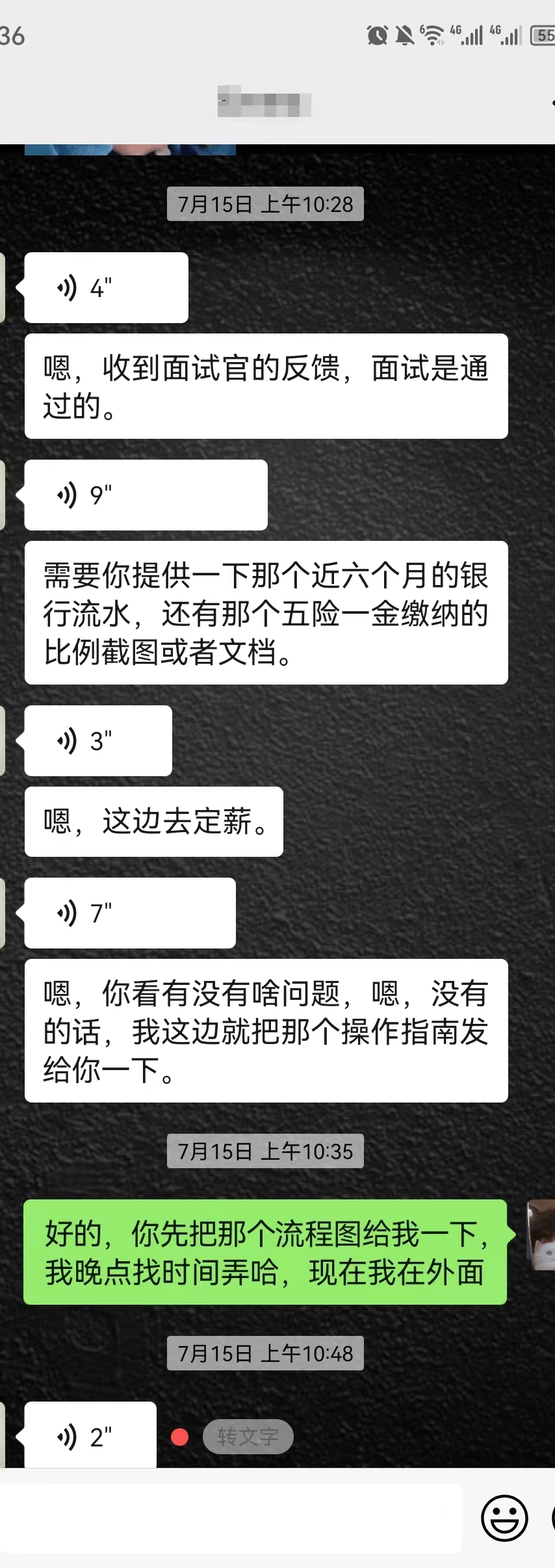 7.15号周六:周六人事微信我面试通过,提供银行和社保流水,以便提供具体的底薪构成—-我提供了并表达了我期望的具体薪资
