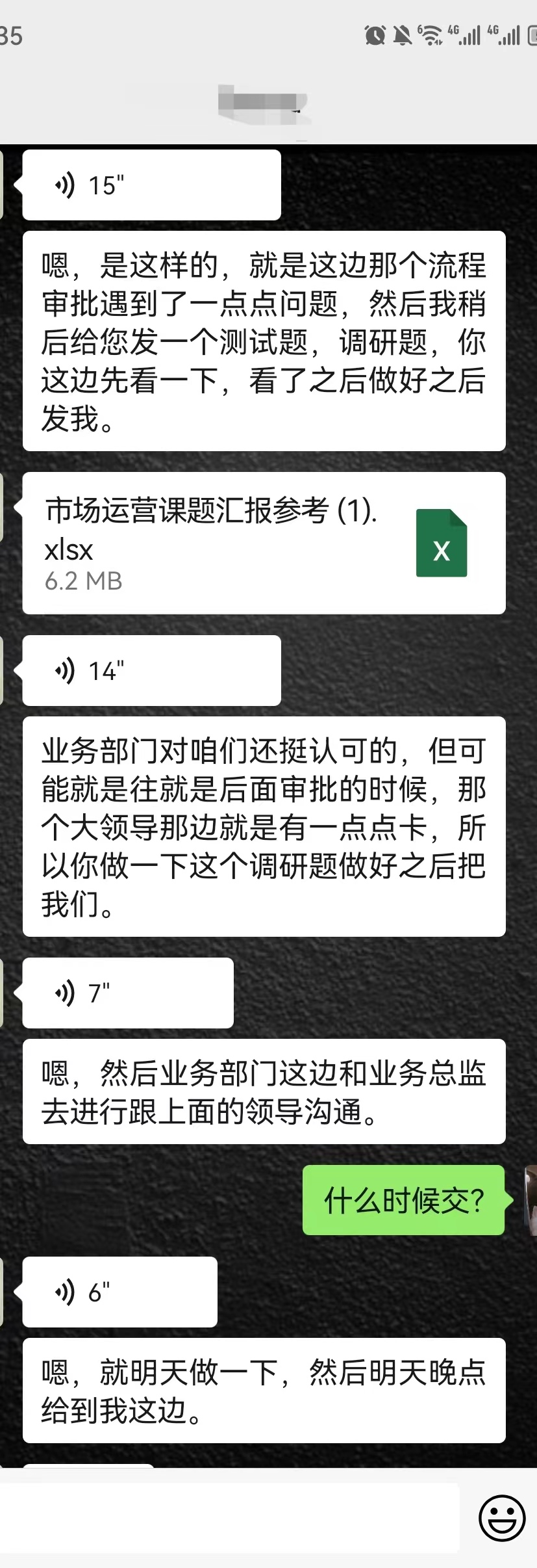 7.18号周二晚上9点多:因为内部问题,人事说我需要参考她发的“市场运营课题汇报”做一份运营报告,并告知尽量第二天交—-我已答应