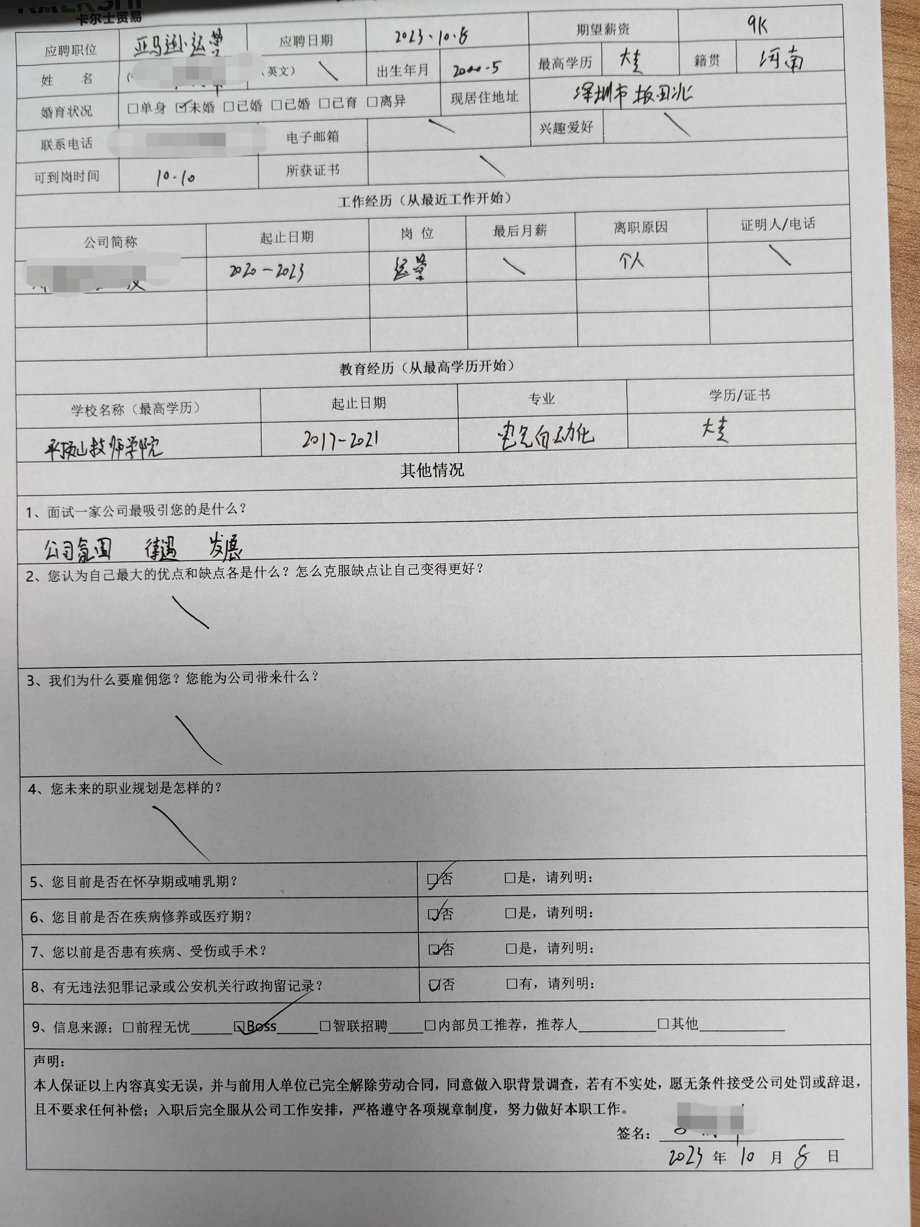 BOSS上写的深圳多乐事科技有限公司,到了地方却是卡尔士贸易,并且离地铁口很远,写字楼很破,进来公司很压抑,里面就几个员工,来了还需要填一份表格(附图),体验很差,面试问为什么不填?我就纳闷了,你为什么雇佣我?不是你没人给你干活打工吗?三个充满睿智的问题,人事说不填不太行,我就直接走了。糟糕的体验。