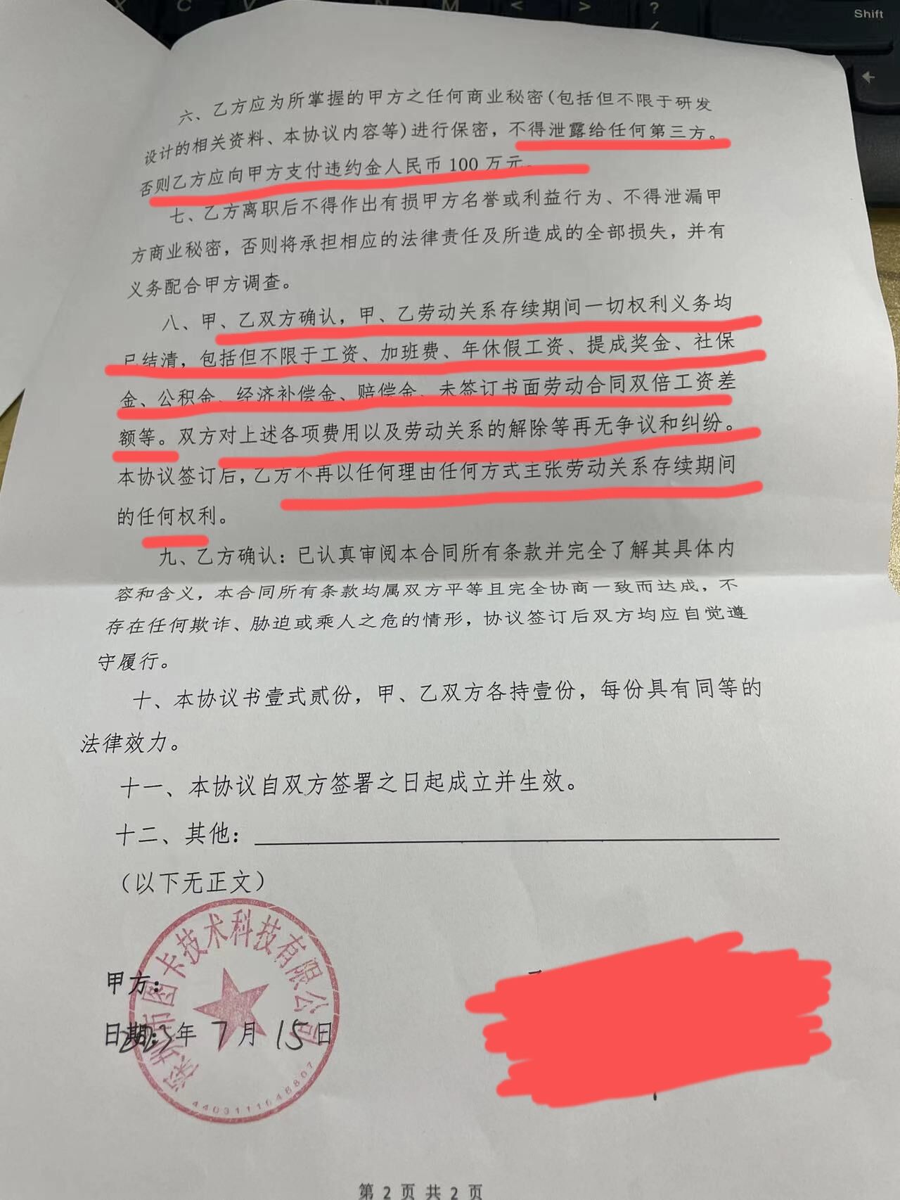 8. 我离职的时候还让我签一堆文件,包含一些恶心人的条款。“离职后不能仲裁公司”–估计是被前面的员工仲裁怕了。“不能转发公司的文件,否则赔100万”–心里一万个CNM。“不能再提加班费,公积金,社保等赔偿”–因为公司一直在违法。