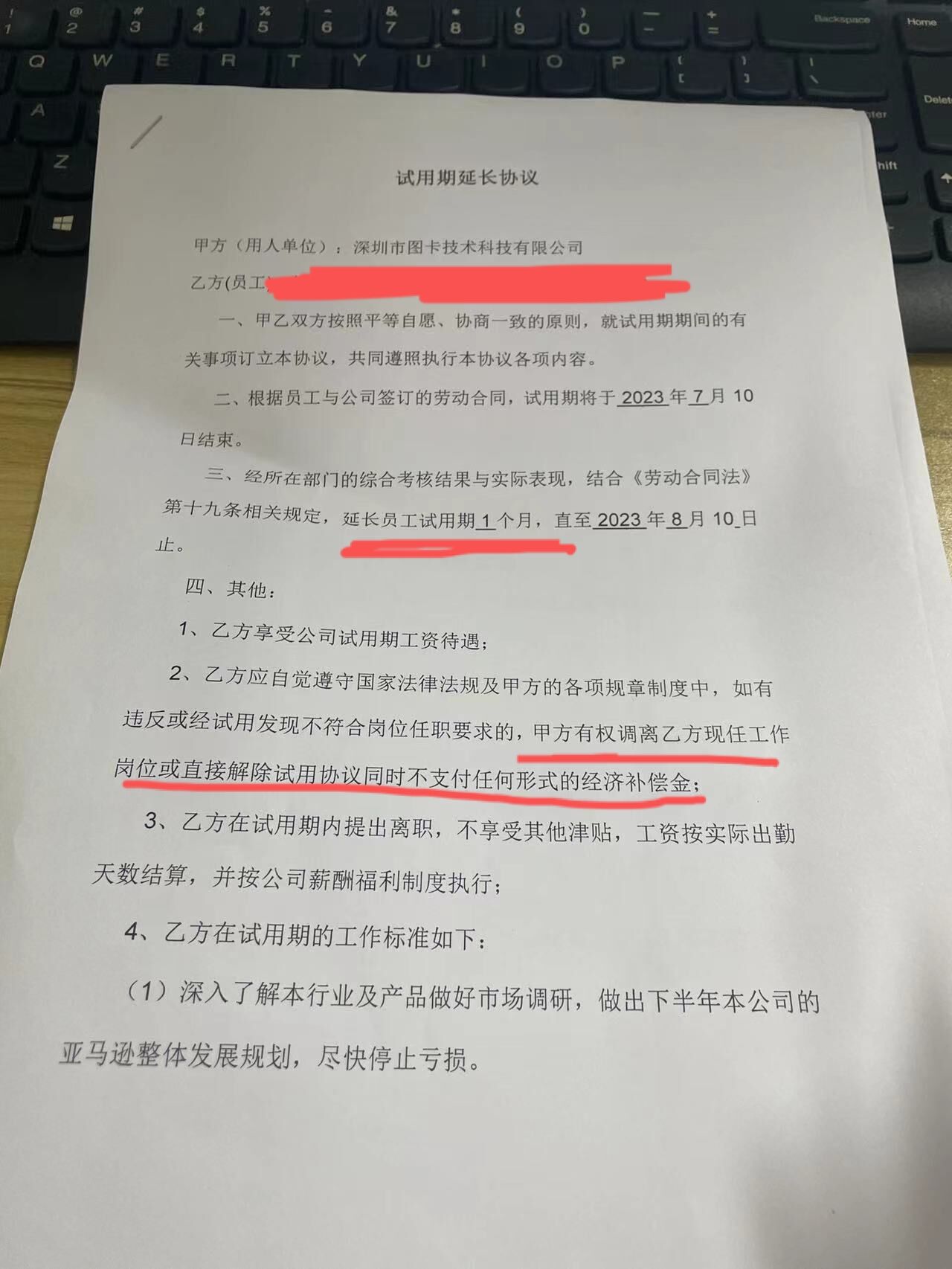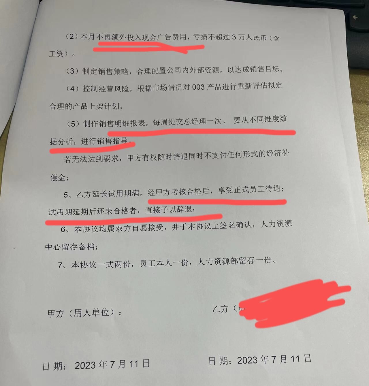 5. 签订“不平等条约”,不平等条约包括很多,大概有这几条“延长试用期” “不再给广告费” “不达要求可以无赔偿任意辞退”,关于这个“要求”你至始至终都不知道是什么,他们说了算,就是希望你一块钱能赚回一个亿。“不再给广告费”–合同写着不再额外投入现金广告费用,亏损不超过3万元(含工资)。这个3w,听起来很多,但是所有工资加起来刚好三万,所以意思是不能再花一分钱广告费!!!ps:前面就花了几百美金广告费,他心疼导致他让我签这个条款。(我看看能不能找到那些合同,附上!太气人了)