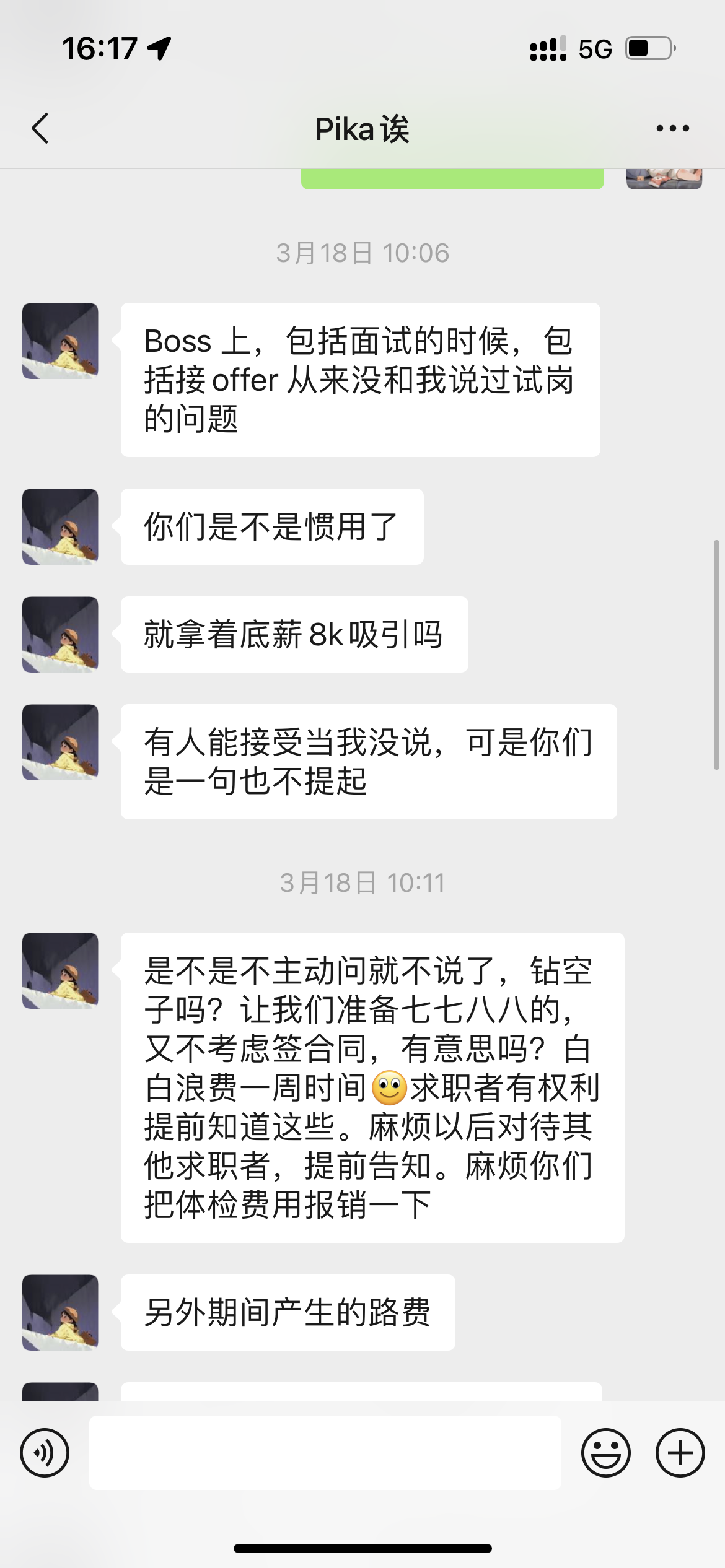 别去!需要试岗三天,一天100,不主动问不告诉你,叫你准备签合同的资料,包括体检的,实际上不和你签合同,说的一个月才交社保和签合同,三天试岗期不过辞退你,薪资写很高,offer 发的是boss 里面发送的,是虚假薪资,hr和你说是无责的,实际上里面不是无责底薪,后面会说是综合包括五险一金公司出的也包含在里面,你不认真她就不会告诉你。反正就是很gou ,很生气,周三去面试,周三晚上打电话给我,问我能不能周四一早就去上班,我说我下周一去,发给我offer,结果体检也做了,啥啥都准备好了,特地问了是不是无责的,hr肯定的告诉我,还说薪资说是老板搞错了,传达错误。我不信你一个hr连薪资都不清楚……而且他对于薪资就是很模糊的回答,一点都不明确,都不知道会不会中间又扣七扣八。无语死了,我刚注册好这个,才出来评论,真的很无语就是了,看到他们还在招聘,真的气死。