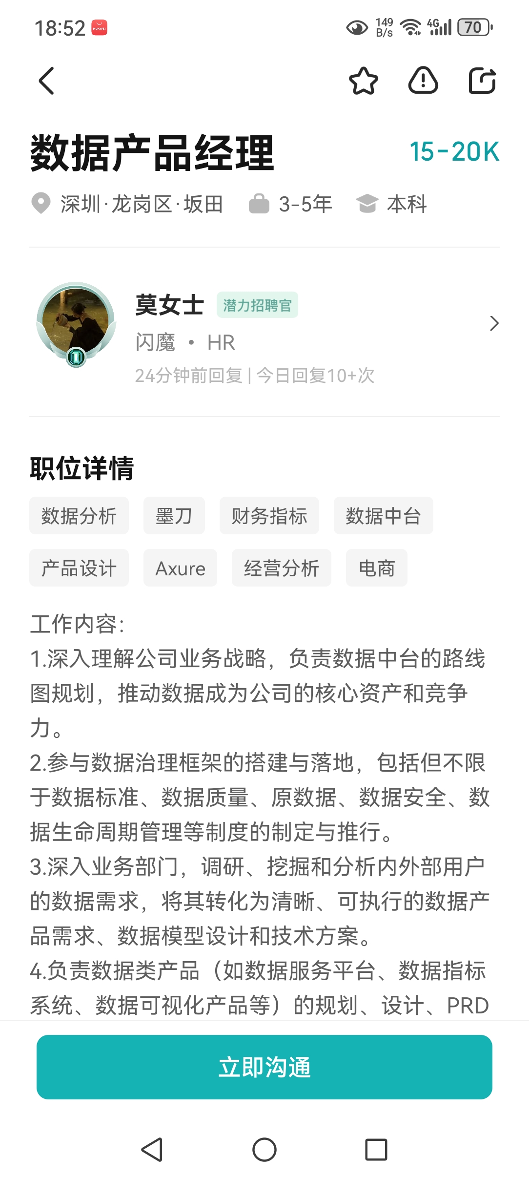 避雷这个姓莫的垃圾,基本叫过去都是套经验,会把目前遇到的问题抛给你个解决方案,面试的是一个傻逼男,看着就是个傻逼,这种就是经常刷KPI的,要不然BOSS上活跃度显示潜力招聘官.
