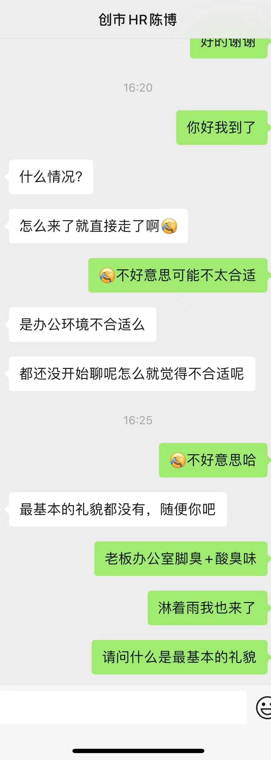 我还在想是实话跟HR说还是找个借口,HR就给我发消息问我怎么了,我想着给他们面子才说不好意思不合适,他追问怎么不合适,我还是说了不好意思,HR说:最基本的礼貌都没有。我说了实情,他没回了。