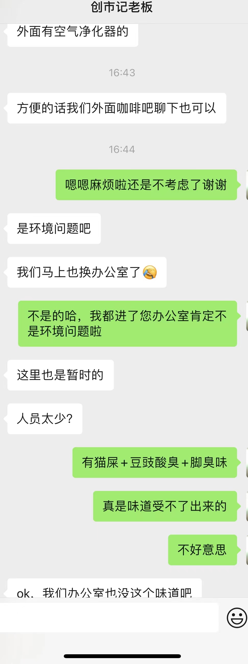 看到黑名单没有才去,公司还没我家大,当时都觉得没什么,一进老板办公室,很浓烈猫屎+脚臭+豆豉酸臭味袭来,要吐的程度所以我打了个转身就出去了。