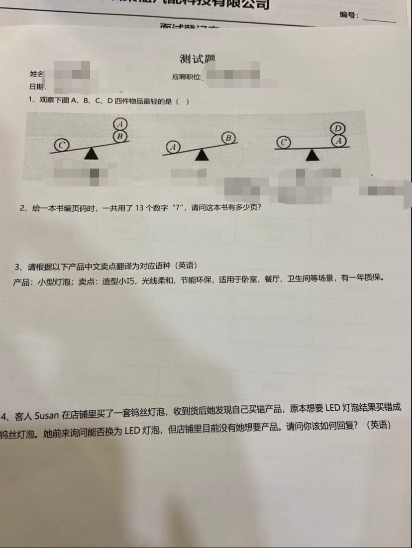 先会让你填资料, 然后给你一张以下测试题(弱智,浪费时间), 我本来一看就觉得这公司有点浪费时间, 很S—B,打算走了,但是看着来都来了,而且没事坐会儿也行,当天应该有不少人被骗过去面试
