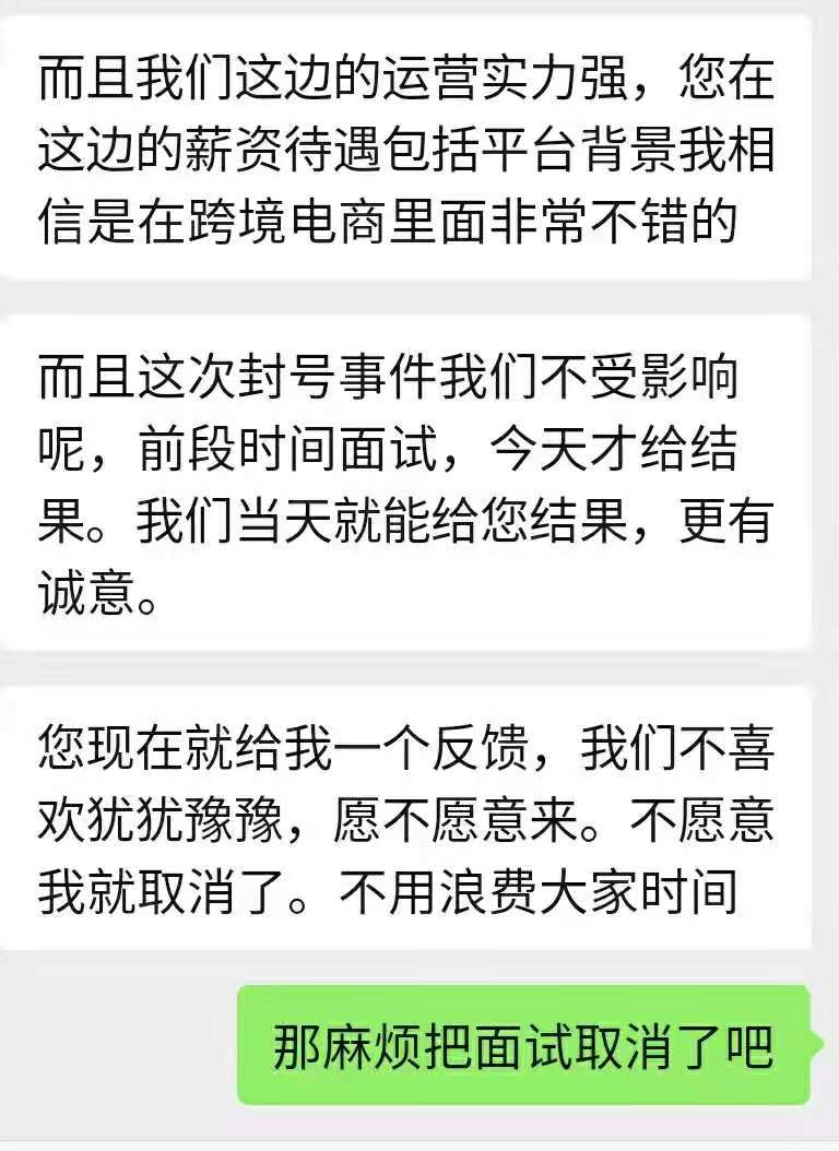 到最后我问她能不能简单介绍一个贵公司的亚马逊业务,她说她不懂,然后我问能不能跟你们亚马逊负责人聊聊,她才说觉得我不合适