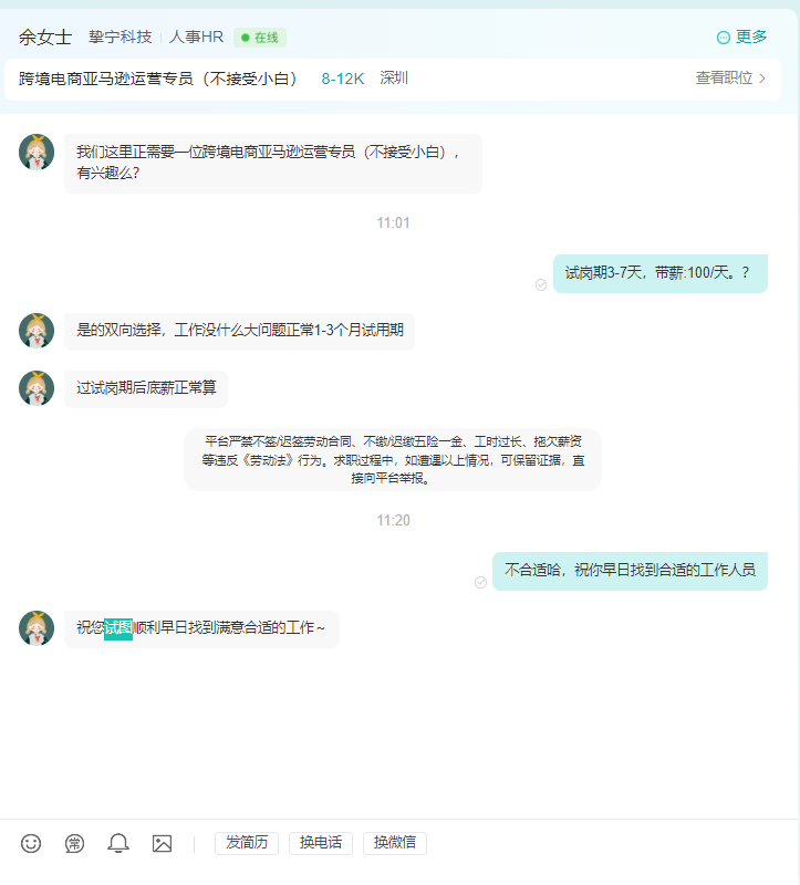 要么这公司非诚心招人,走的是铺货模式(虽然招聘详情写的精铺路线),就靠100/天的试岗期,不断招聘熟手来给公司运营,利用低价日薪让源源不断的熟手运营操盘,完了卸磨杀驴。(个人推测)