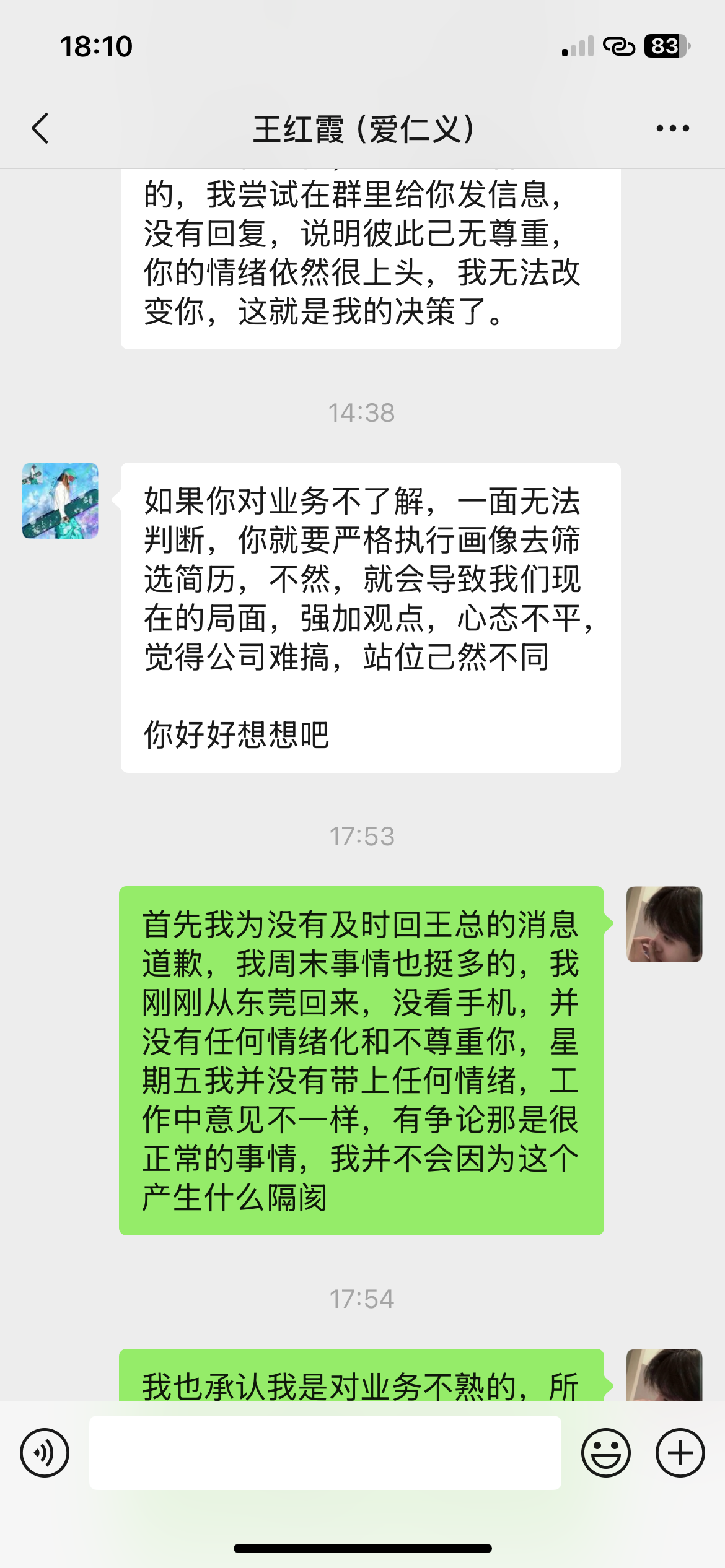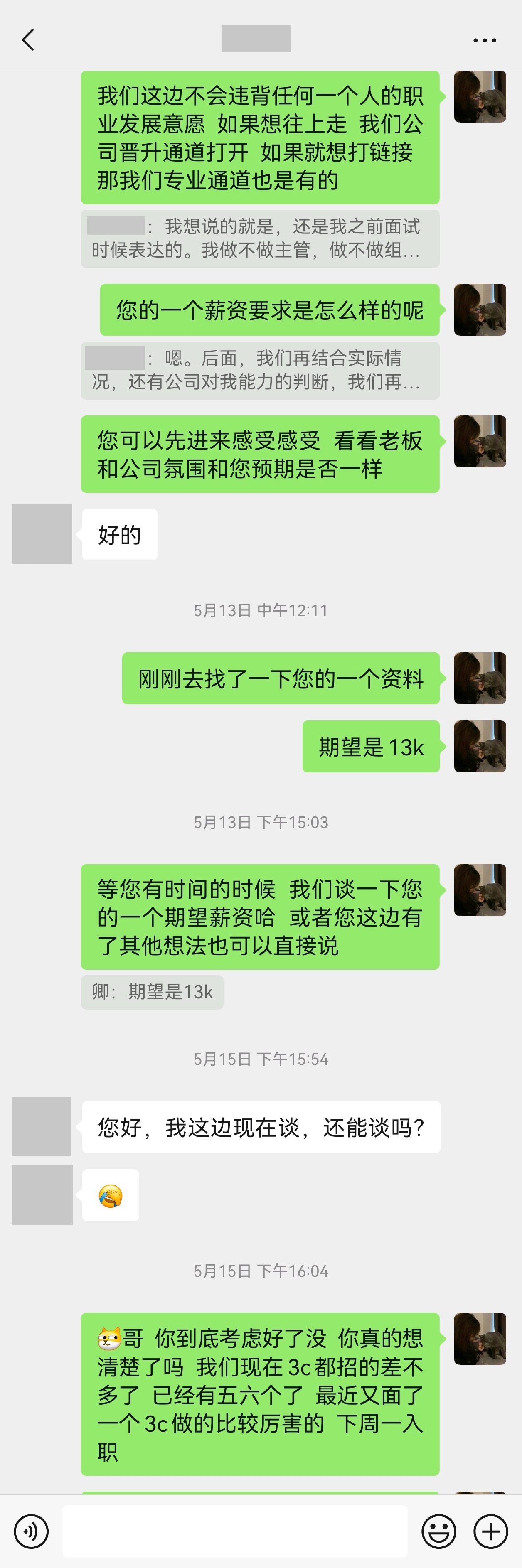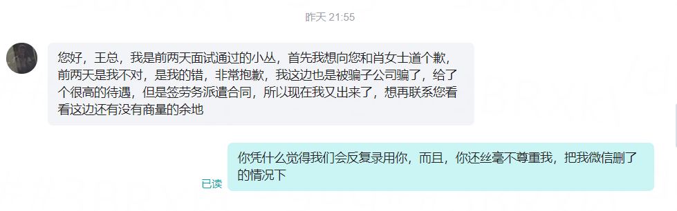 最后还是要对王总,肖人事道个歉,确实我有不对的地方,我放了鸽子,这是我的问题,但是你们也要反思,一个是你们流程是有问题的,第二个就是创业一定要有胸怀,和气才能生财,第三个就是要真诚,不是我不尊重你们,是您们不尊重我,我又不是应届毕业生,你们什么想法,难道我看不懂??