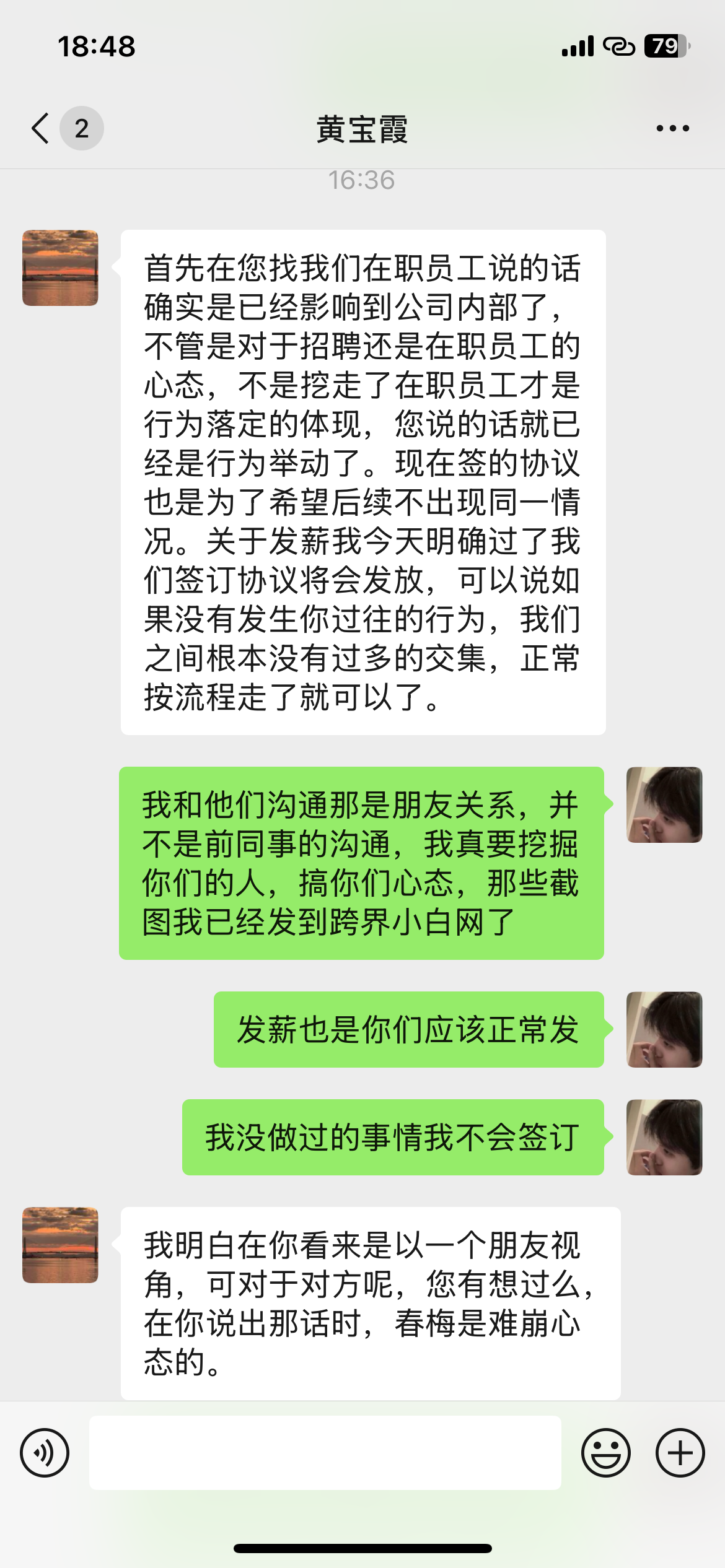 第一:首先你没经过我的同意就把我的聊天内容公布出来了?是不是有点过了?你以为别人的聊天记录是你想怎么发就怎么发吗?谁教你这么做人事的