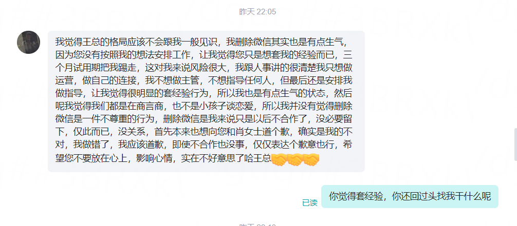 首先我确实也存在问题,但是也可以明确的看出来老板没有任何格局和胸怀,我当时确实有4家OFFER, 我开始没有选择这家,入职另外一家后发现是家骗子公司,后面又找这位王女士协商,被王女士回绝,并批评了一番。当时拒绝这家公司还有个很重要的理由,就是这家公司明显的套经验,老板的理由是招满了,招我来只能指导别人做,那我想请问你现在BOSS的多个运营招聘信息是虚假的吗?招满了可以不招,为什么还要招人呢?这里明显没有合适的理由,就是套经验,已经明显的写在脸上了