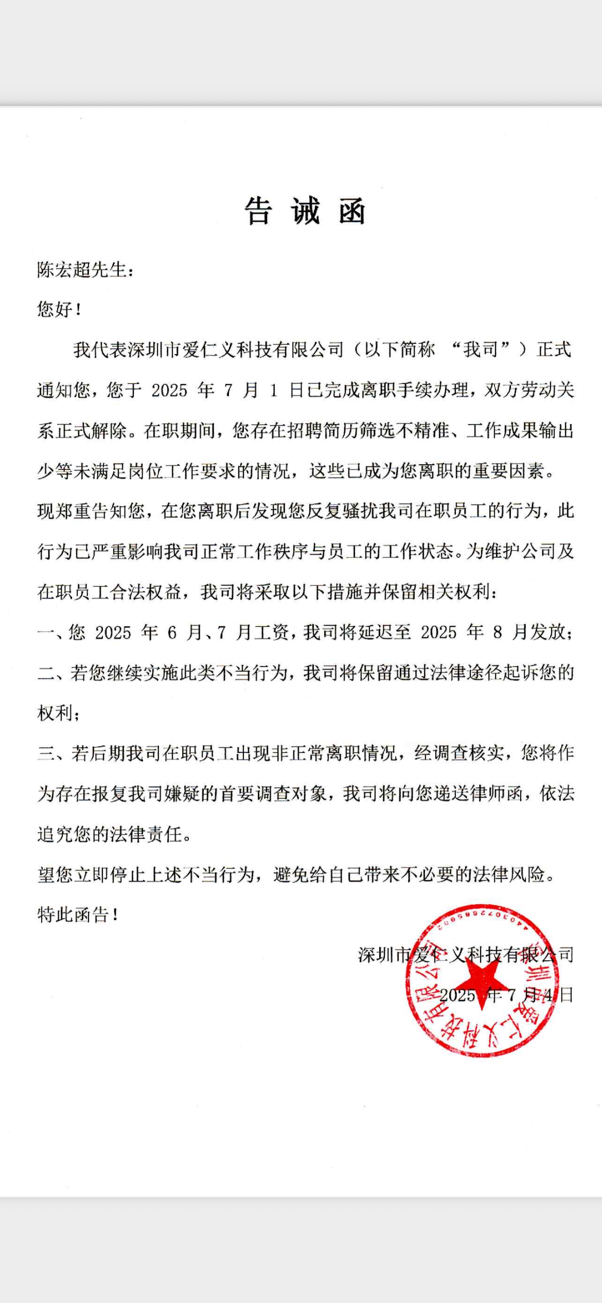 深圳爱仁义这个公司,只能说是深圳最垃圾的一个公司。公司头头王红霞,说是老板,其实就是个打工的。6月13号,我参加了他们公司的面试,王红霞这个人刚认识是一个很擅长伪装和pua的一个人。当初面试看我的薪资流水,我当时因为是猎头转甲方hr,我就就自愿降薪了,她得了便宜还蛮乖,一直说担心我在她哪里混不好,说和之前的招聘主管开会讨论我的薪资,还给我招聘提成和福利。其实就说一个画大饼。还没入职就和我协商给她招人,然后就开始给我算工资。我拒绝了,然后硬塞给我,说什么说出去的话不实现,她在公司没有什么威信力。最后是和我玩了一个文字游戏,招到一个人给一天的工资,也就说是一个星期的工资要入职五个人,放在那个行业都是一个极其恐怖的数据,其实她就是想着套我手上的人才库。然后还一直和我沟通招聘,一直套我的招聘手段和思路,然后进行模仿。还没入职前,我邀约的候选人,就除了一个我没有陪面,其他候选人都是这边公司晚上下班后跑到她公司陪面。她面试都是鼻孔看人的,不相信候选人说的任何话,一直按照她的逻辑思维和脑子里面的数据去证实候选人说的话是否真实,但是她一点也不懂业务,自己都是做产品开发出生的。当时居然让我去招一个底薪15k能做35w美金业绩的高级亚马逊运营。我当时直呼666。6月23号入职当天,我居然发现我入职的上周五,把公司的招聘主管和招聘全开了。。。然后在职的一周,邀约的几个面试,居然还能和候选人面试能吵起架来。。。然后有一个候选人空档期比较长,然后她觉得这个人还不错,约过来面试,还没坐下来面试就说本来不想约你过来面试的,空档期那么长。。。。她聊完又发现这个候选人还不错,又舔着个加人家微信。候选人回去把她删了她还生起起来了,说这种人出来找什么工作。然后就一直大晚上十一二点给我发消息,说招聘应该怎么怎么做,公司什么情况,我还和她交流。是我们面试应该要反思,为什么候选人过来面试体验感都不行,我们应该怎么调整。她居然说什么都不合适,她们的体验感和我们有什么关系。我说坂田这么多跨境电商公司,做招聘也要竞争,要做出亮点来,你不懂业务就让运营经理去面,反正是他要人。然后气冲冲跑到办公室来和我吵,说她没有问她,说我一个星期就进来了一个运营组长,我在躺平。就这样吵看一架。然后第二天周末又一直一直给我发消息,我出去玩没有看微信。就发微信说我不尊重她,不回她微信,说我因为和她争吵,还在耿耿于怀。拜托,我周末双休,我有什么义务回你的消息,以为大家都和你一样,心胸那么狭隘。当时我还出于礼貌和她道歉,说明来尾。七月一号,行政和我核对工资,核对下来我记得她和我承认的和实际的完全不一样。我就问她,她就说我的工资贵,四千块钱招聘一个人才,还说我在职一个星期没有招聘成果,我周末不刷boss,平时不加班。尼玛的,所以面试时候说的不加班,双休都是放屁咯。最后就7月1号上午就离职了。离职没过两天发消息说我挖他们公司的人,怀疑我和之前的猎头公司联合挖他们公司的人。你凭什么觉得你的逼脸有那么大,公司上上下下就10个人,还需要特意离职,入职你公司来挖你的人。然后就借着这个不发我工资,然后我就走劳动仲裁,知道我在仲裁她还死不知错。然后和我说什么竞业协议,竞业协议的钱都没给,谈你妈的竞业协议。后来又想和我协商,让行政联系我,结果那个行政也是个狗腿子,约的我下班晚上八点,然后发我鸽子,一直和我说她就在公司附近,他在吃饭。我想请问六点半下班到晚上八点半两个小时吃不好一个饭,到八点半了就去吃饭,吃你妈呢,契约精神呢。后面我就拒绝调解直接走劳动仲裁了,还一直变着法让我签免费的竞业协议。现在这家公司运营已经没有了,跨境电商的兄弟姐妹好好想想为什么,入职的人在职平均下来就最多两周的时间。下面是我和她的聊天截图和劳动仲裁的全过程