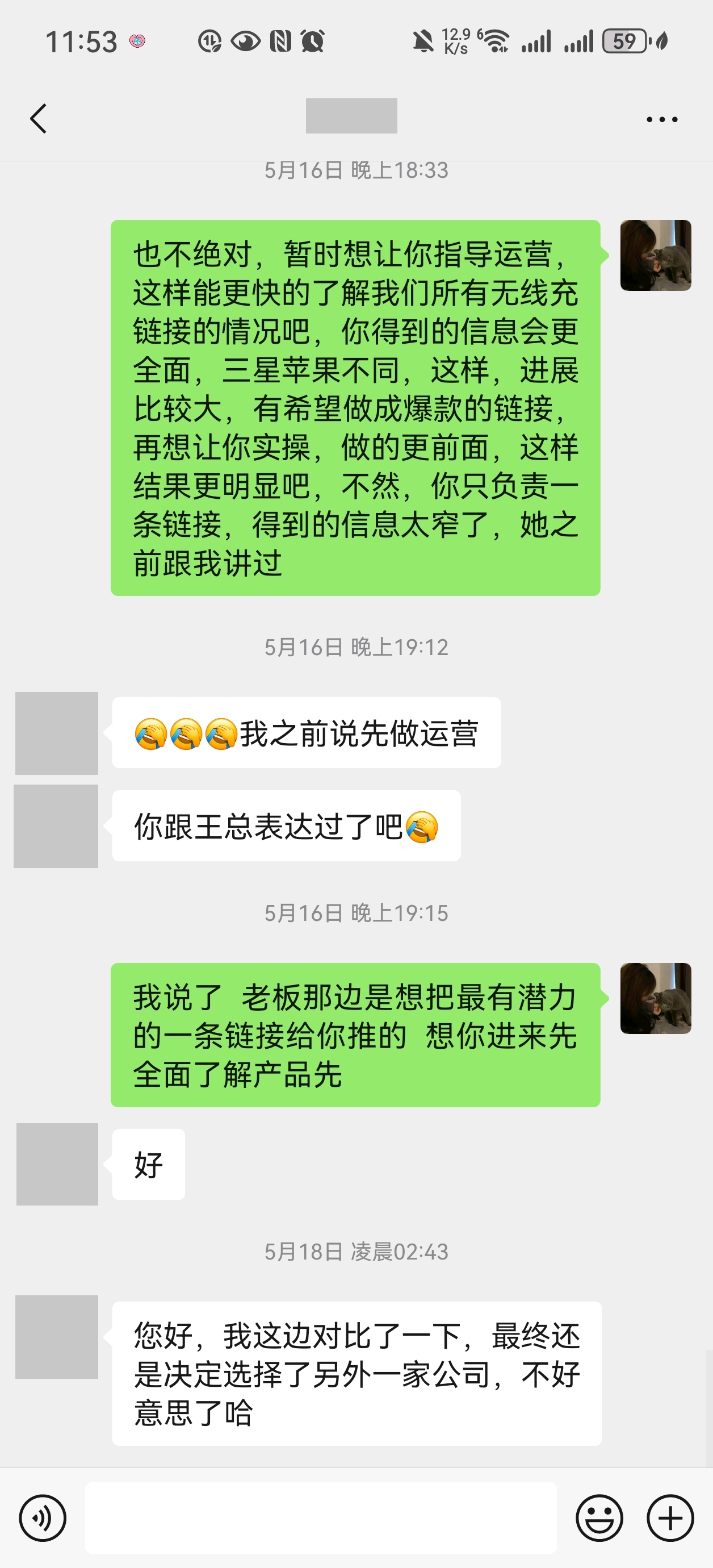 第四:我为什么回来找你们,是因为我对3C类目很熟悉,对该产品很有信心推上来,我也找到了你们的连接,大概整理了一下思路,我想可以试试,我又觉得王总的格局应该没那么低,但是介于之前安排的工作是要求我全程指导别的运营做连接,我觉得可以找老板商量一下能不能我自己实操,所以就抱着试试的态度来商量一下,谁知道那么小气,好家伙,可算让你们得着机会出了气了,好!你们开心就行,怪我高估了你们