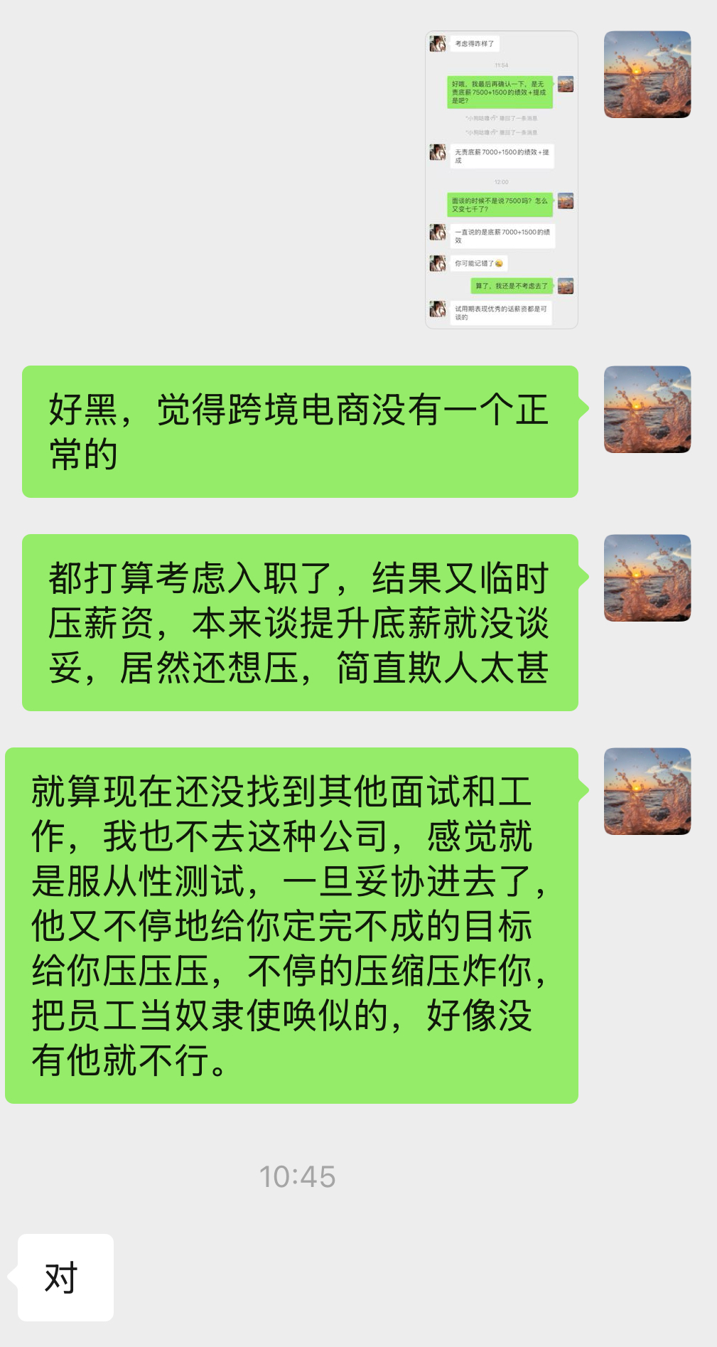 最关键的是,薪资问题,明明面谈的时候说是无责底薪7500+1500绩效+提成,这么重要的信息我敢保证自己绝不可能记错。这底薪比我上家公司还少,我就说回去考虑考虑。回去后我就跟他们人事在微信上谈能不能将无责底薪提到9k,我就入职,结果是一点都不肯提。我就说那再考虑考虑吧,迫于我已经一个月没工作也挺久了,加上现在市场环境不好又是毕业季,加上征询了一下朋友意见,我就想入吧。