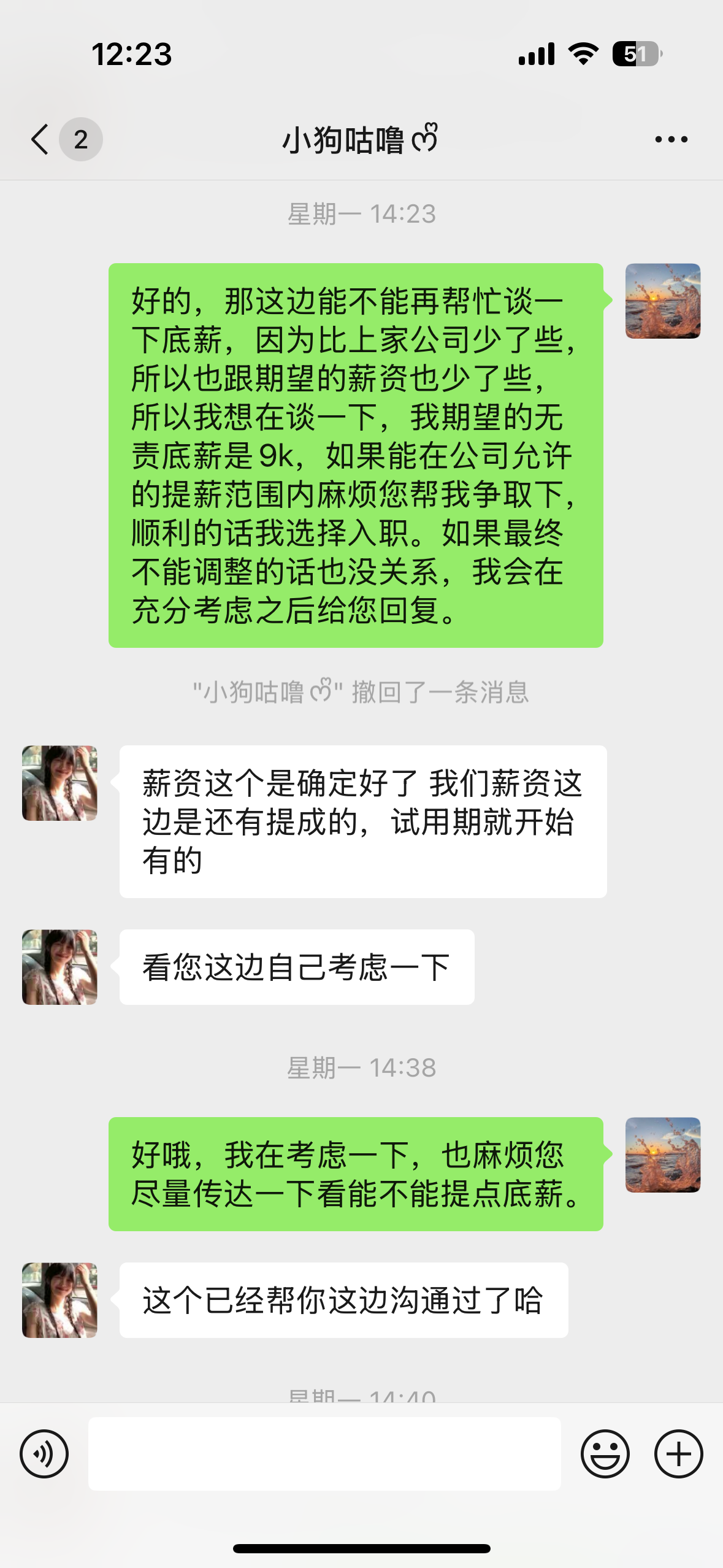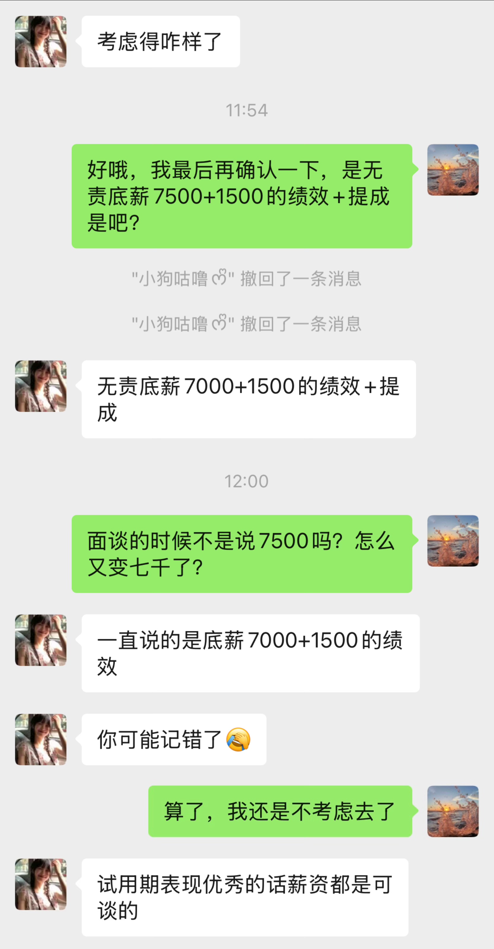 第二天他hr又来问我考虑清楚了吗,我就最后跟他确认一遍薪资构架,无责底薪7500+1500绩效+提成,而且hr也回了是的,只是很快又撤回了,大家可以看到截图里撤回的就是确定的消息,结果这个时候,他又变卦了,说是 无责底薪7000+1500绩效+提成.这就真的太低了,还没以前公司高我跳槽为了啥?领导一句“可能记错了”,打工人连反驳的证据都没有?!