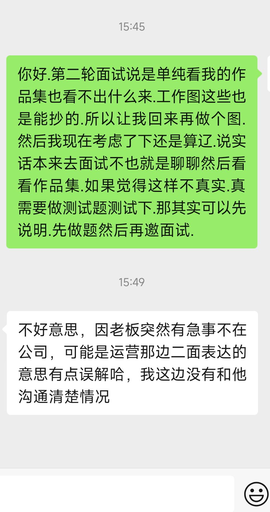聊完过了一会又来了个人聊.没说是干嘛的.我以为可能是负责美工的领导什么的.坐下又继续问我一些情况.看了我作品集.问期望薪资.我说期望薪资11k.他说为什么会提这么高的薪资.他觉得美工11k已经是比较到顶的水平了.说他的朋友在长沙做了7年.是美工主管也就13k.然后可能觉得我水平不够又或者怎么样.说他以前也是做过这个.说其实看这个作品集也看不出什么真实水平.我说这些都是我工作图.他说工作图也可以是抄的.说想要让我回来再做一张主图看看.我不大想多聊了.就答应了说那就boss上再联系吧.回来后hr加了微信.我就直说不做了.这时才知道第二轮那个是运营.