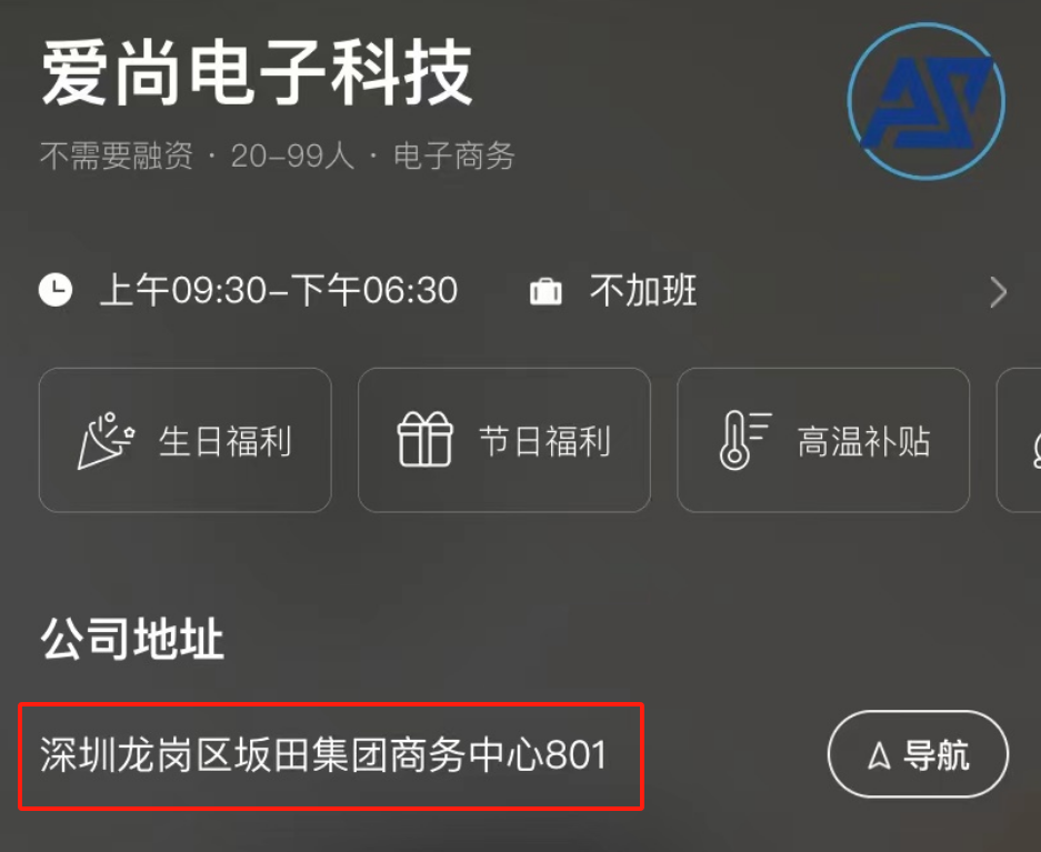 2:关于地址:深圳市爱尚电子科技有限公司 现在的办公地址也就是Boss直聘的地址:深圳龙岗区坂田集团商务中心801