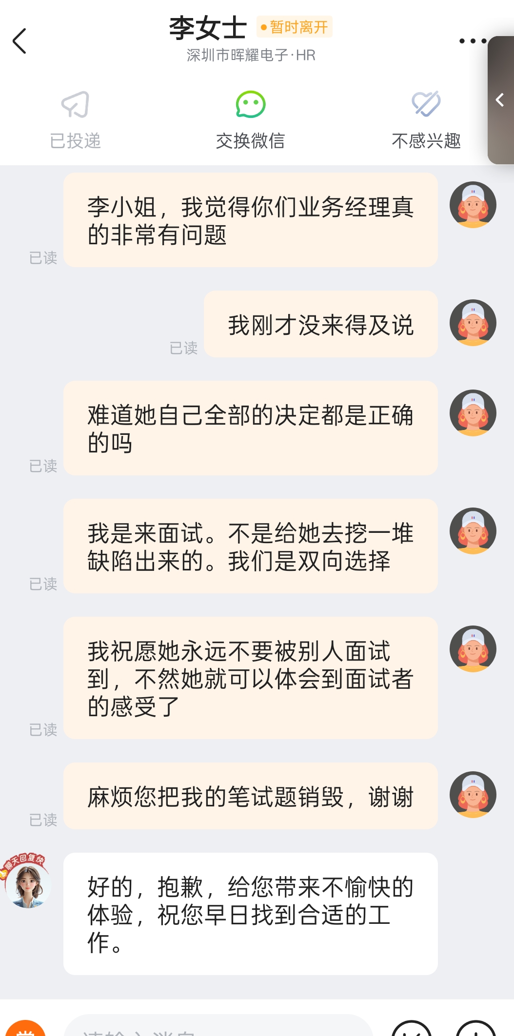 写了几个笔试题啊,反正我用豆包去搜了一下,因为我在写这个题目的时候已经感觉有点不对劲了,感觉他们好像有点怪怪的。最后到那个部门经理给我面试的时候,我就彻底感觉不对劲了。一开始,我看见了她的脸色,就觉得很气血很不足。我就能感觉的出来这个公司不怎么样,然后呢。我已经跟人事解释过一回,我那些每段工作经历了,她还要重新问我说,我每段工作经历啊,怎么都是一两年。完了我给她解释了客观原因之后,她还要去深挖我个人原因,说不可能只有公司原因啊,肯定我自己的原因也有在。那我又解释了一遍我自己的个人原因,她还说你觉得你做的决定是错误的吗?怎样怎样的,这一段工作怎样那一段工作怎样。她就老是想挖出我所有的缺陷,我不懂这人是不是🧠有病的,我是去找工作不是去给她挑毛病的,还问我疫情时候大家都难过,我怎么不继续做,我说我判断错误了这个我承认,我特么那时候就应该说我的确错了,不应该脑子一热继续呆在他们公司被无偿拷问的。。真特么无语了。。我实在受不了就说不好意思我大概知道他们团队是什么氛围了,我不太喜欢,不想继续面试了,她还错愕了一分钟,我推门出去她才缓过来,估计没几个像我那样直接说她🧠有病的吧!哈哈哈哈