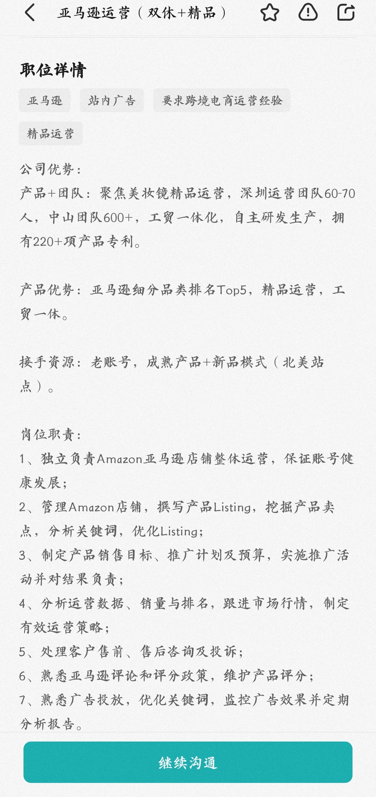 • 链接:一个店铺多人运营,按sku划分,每个人到手2-5款产品。转正条件是在你接手的sku之前的基础上做到5w的毛利增量(有的人是3w,跟你要的底薪高低挂钩),完不成就延迟转正或无法转正。产品是自家工厂生产的,但很奇怪的就是明明是工贸一体的, 成本却没有任何优势,价格很难跟竞品竞争,甚至有些品类的产品价格被竞品吊打。想做出净毛利,拿到不错的提成,难度不小。