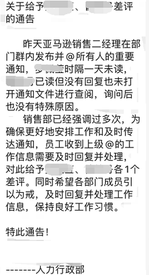 3.上面朋友说的群里未读消息或者已读不回会受处罚,估计很多人都没见过这种处罚吧?来见见世面,看截图,当事人打个码。这也是一种职场PUA吧,感觉完全疯了,就逼着你向上级反馈,未读不行,已读不回也不行,回了不下载文件也不行,相当地PUA。