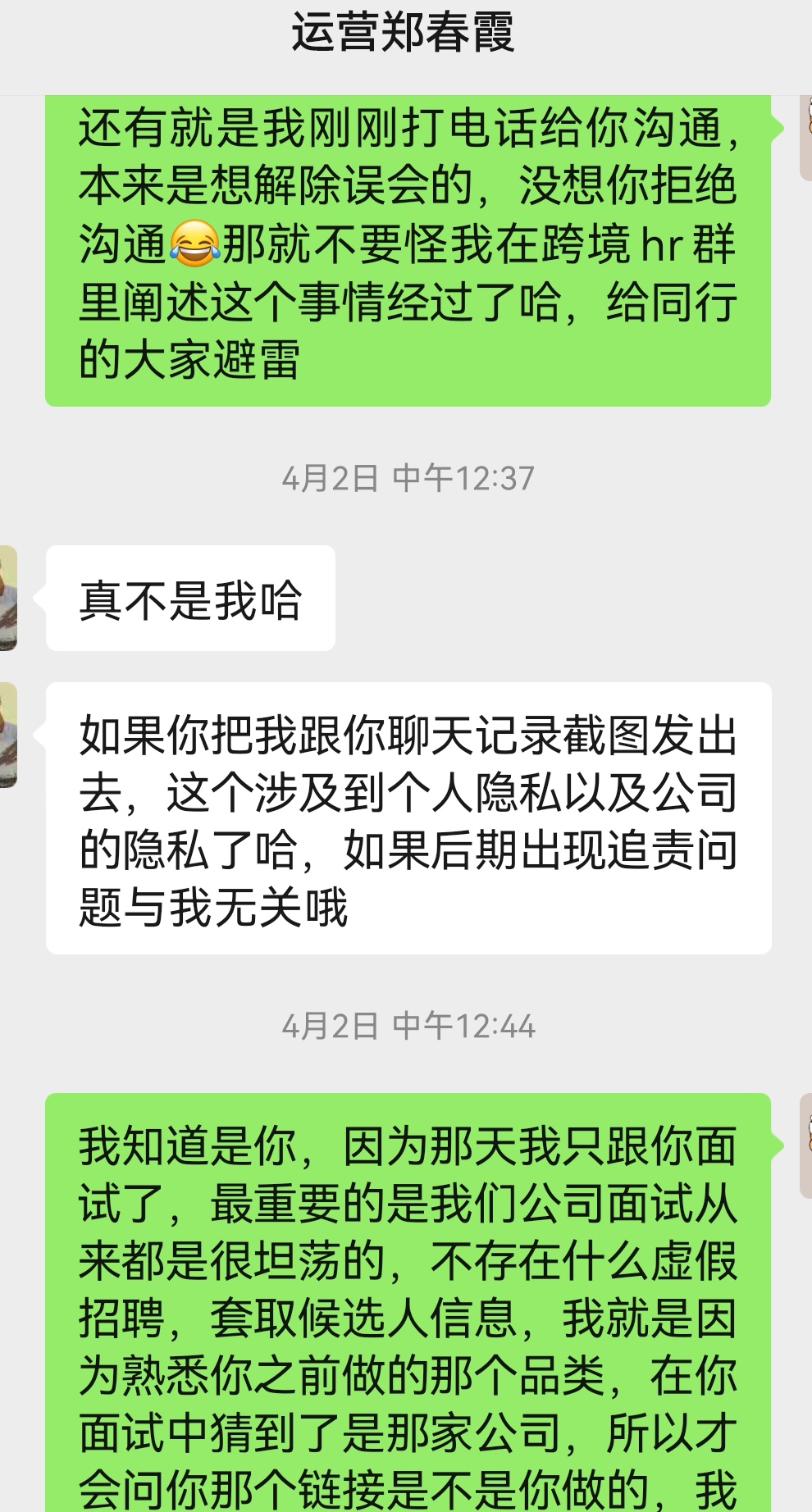 以上是面试当天的聊天记录,以下是发现帖子后打电话给她 被挂断电话拒绝沟通后的聊天记录,对方还一直否认不是自己发帖,直到我说我会在帖子下面贴出跟她的聊天记录以及面试过程自证后,对方才承认,说是我侵犯她的隐私权,那我们公司的名誉权呢?